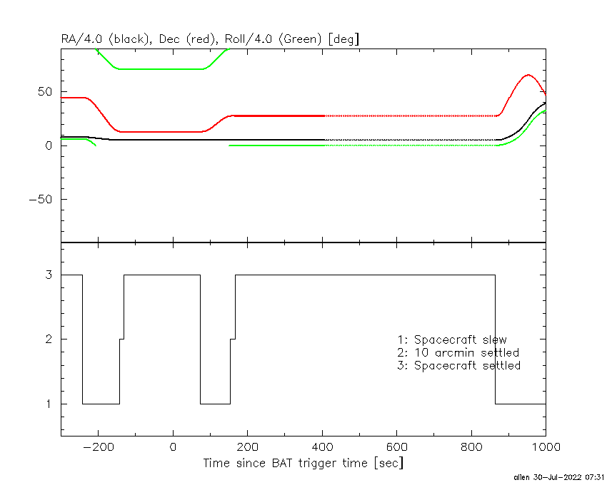 - 4) The verticle lines correspond to following: green dotted lines are T50 interval, black dotted lines are T90 interval, blue solid line(s) is a spacecraft slew start time, and orange solid line(s) is a spacecraft slew end time.