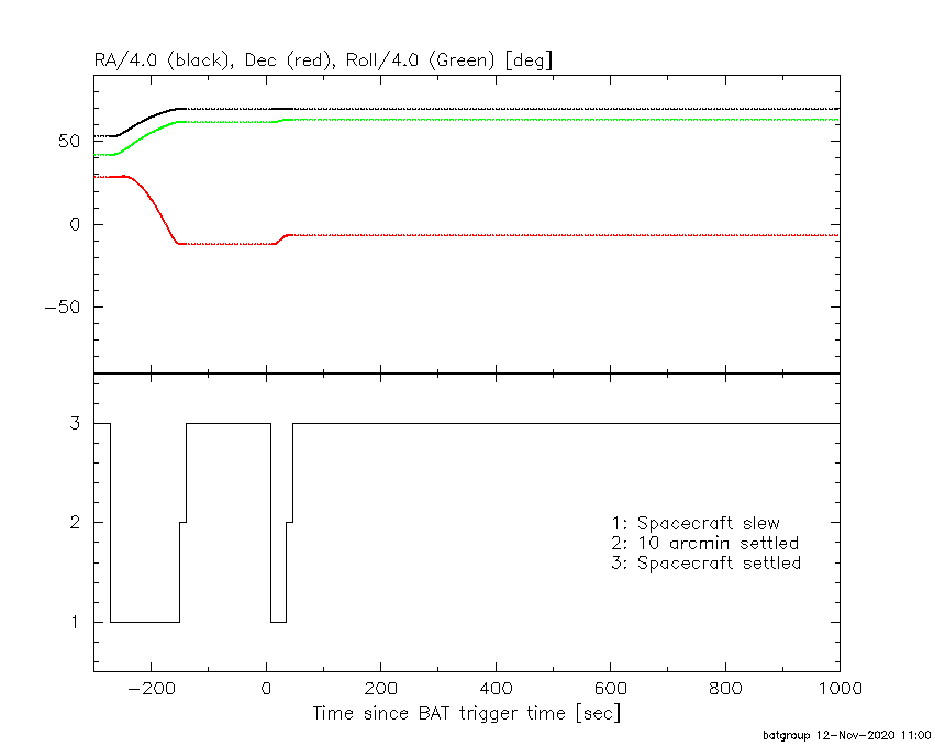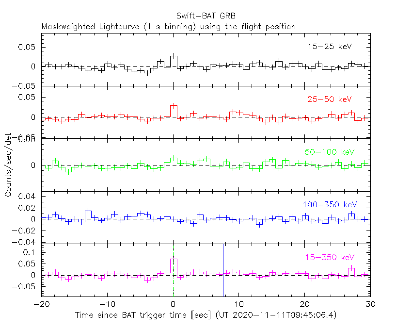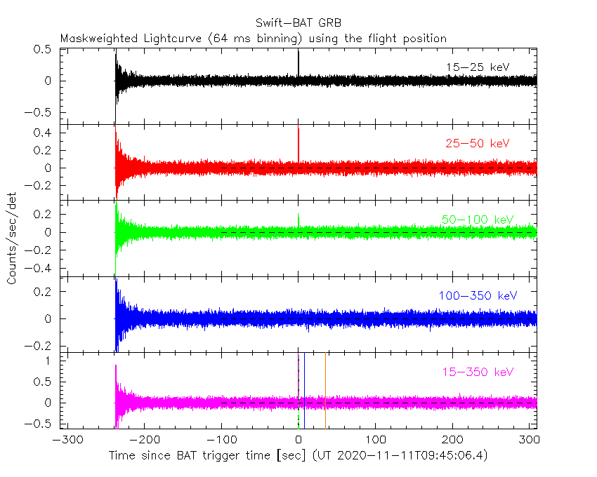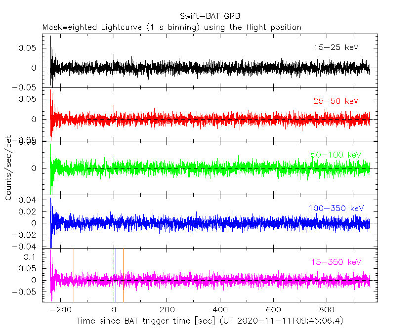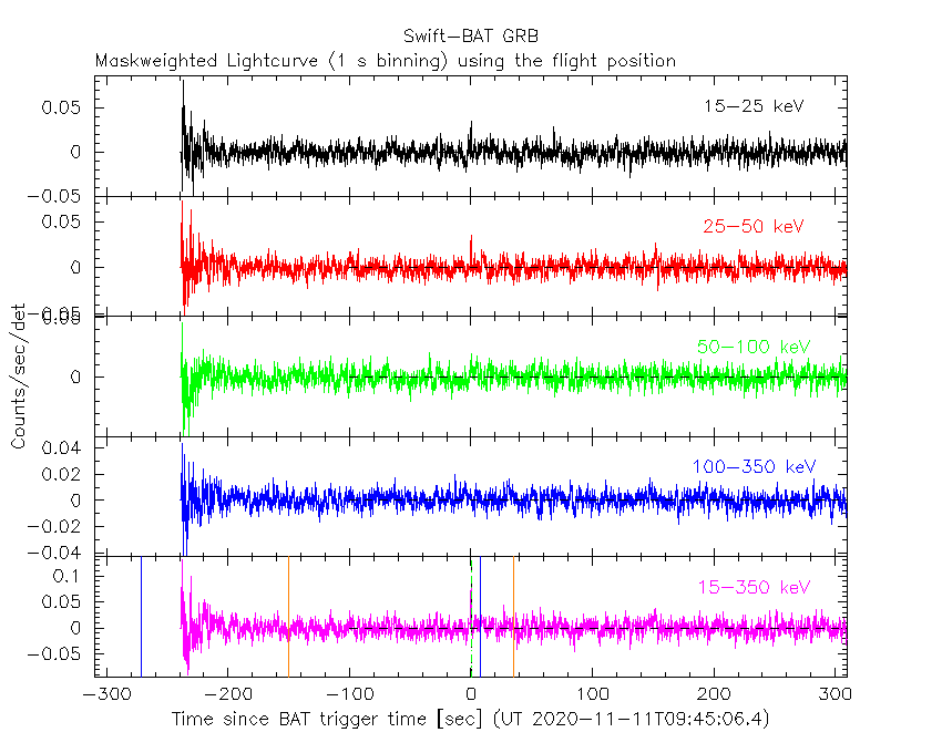 - 5) The verticle lines correspond to following: green dotted lines are T50 interval, black dotted lines are T90 interval, blue solid line(s) is a spacecraft slew start time, and orange solid line(s) is a spacecraft slew end time.