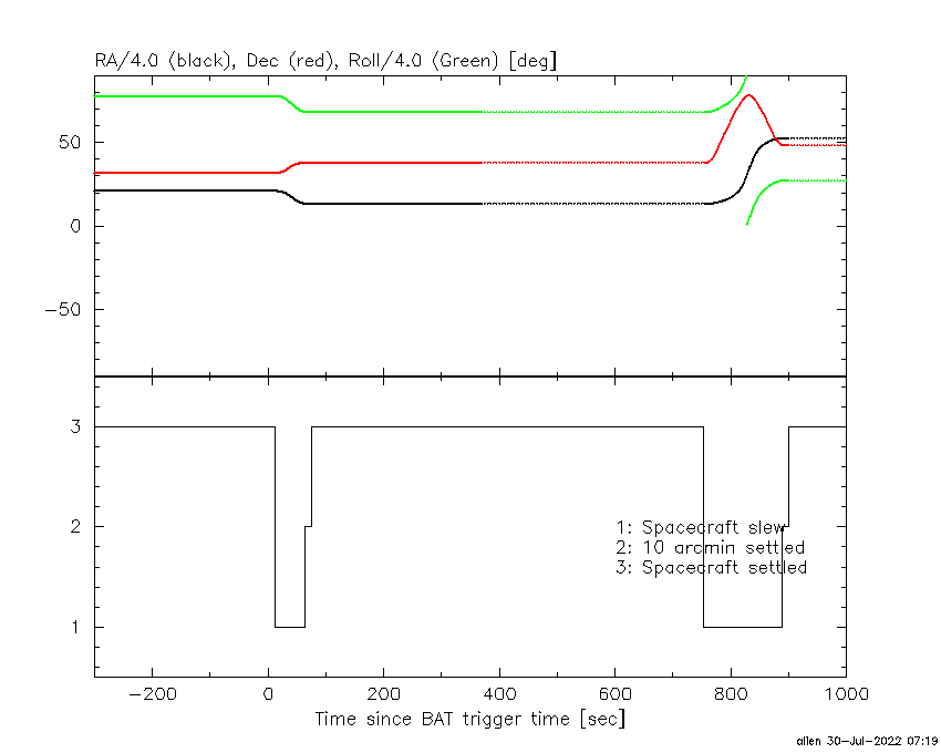 - 4) The verticle lines correspond to following: green dotted lines are T50 interval, black dotted lines are T90 interval, blue solid line(s) is a spacecraft slew start time, and orange solid line(s) is a spacecraft slew end time.