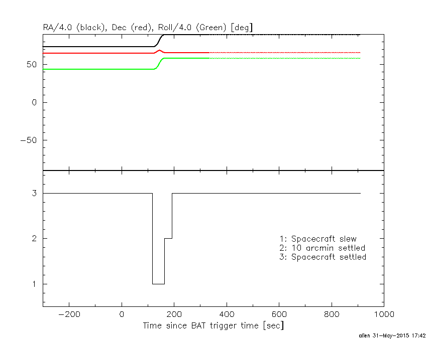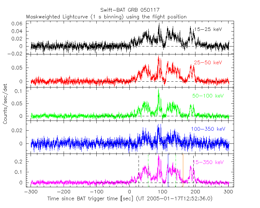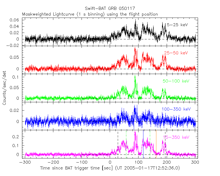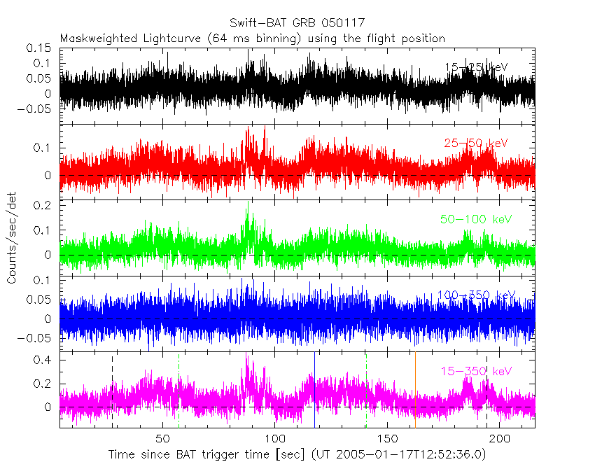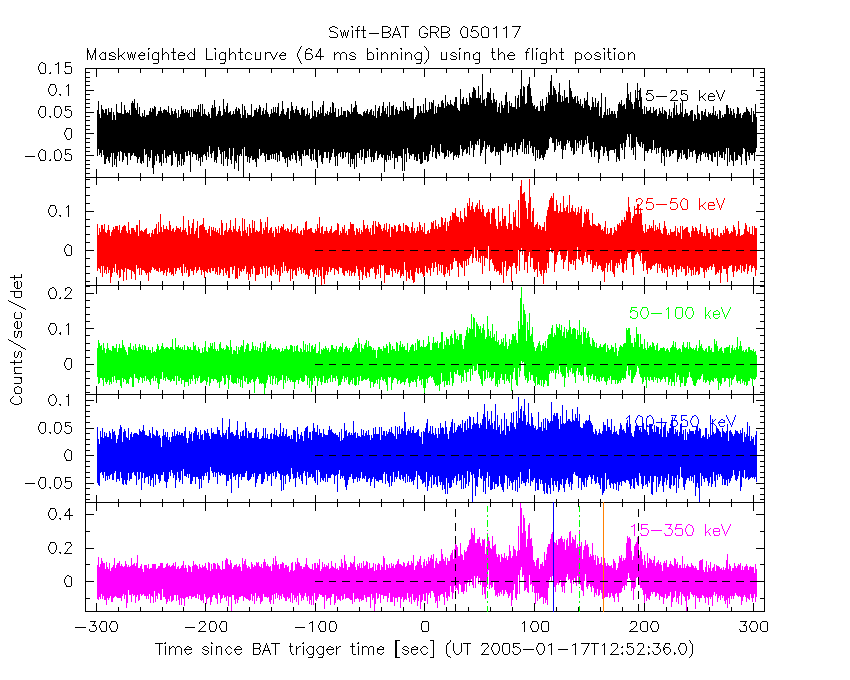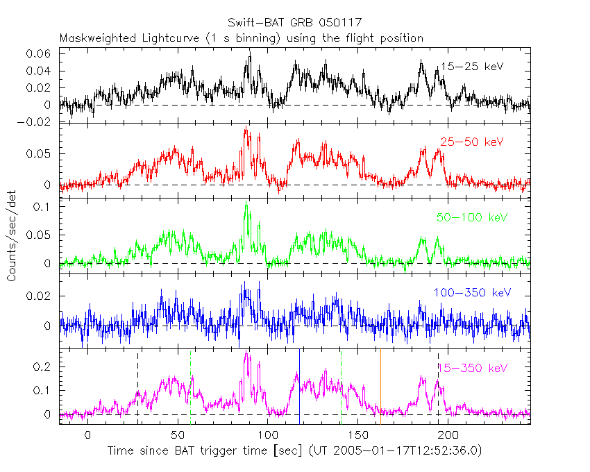 - 4) The verticle lines correspond to following: green dotted lines are T50 interval, black dotted lines are T90 interval, blue solid line(s) is a spacecraft slew start time, and orange solid line(s) is a spacecraft slew end time.