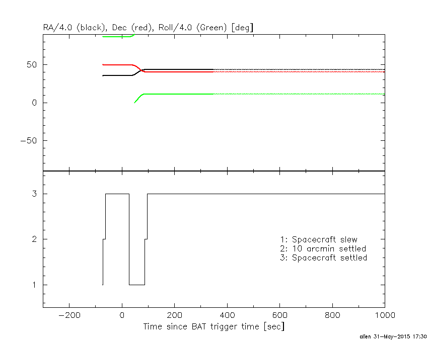 - 4) The verticle lines correspond to following: green dotted lines are T50 interval, black dotted lines are T90 interval, blue solid line(s) is a spacecraft slew start time, and orange solid line(s) is a spacecraft slew end time.