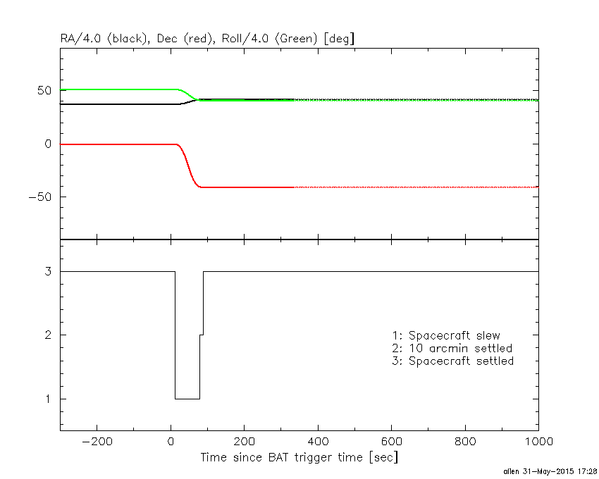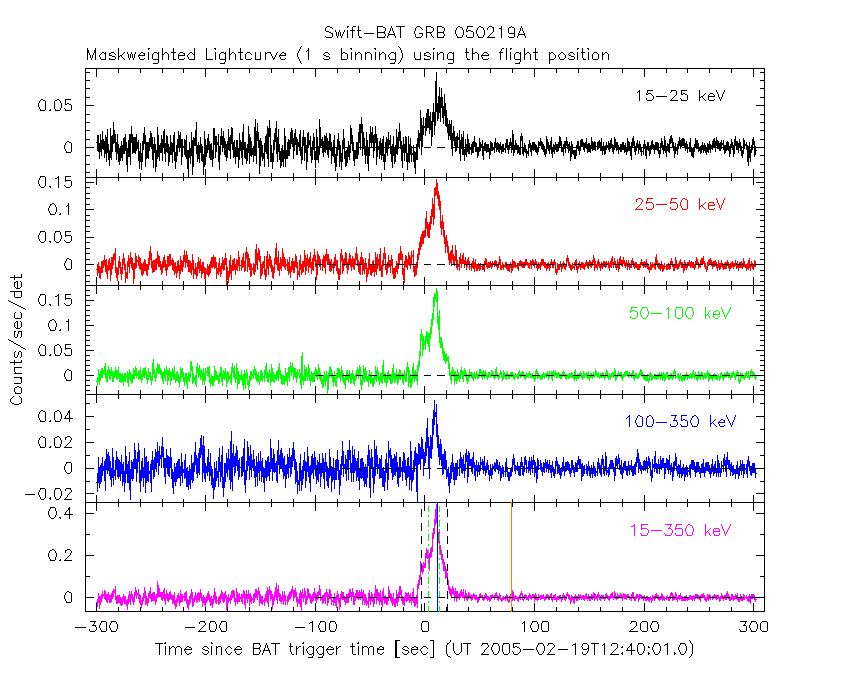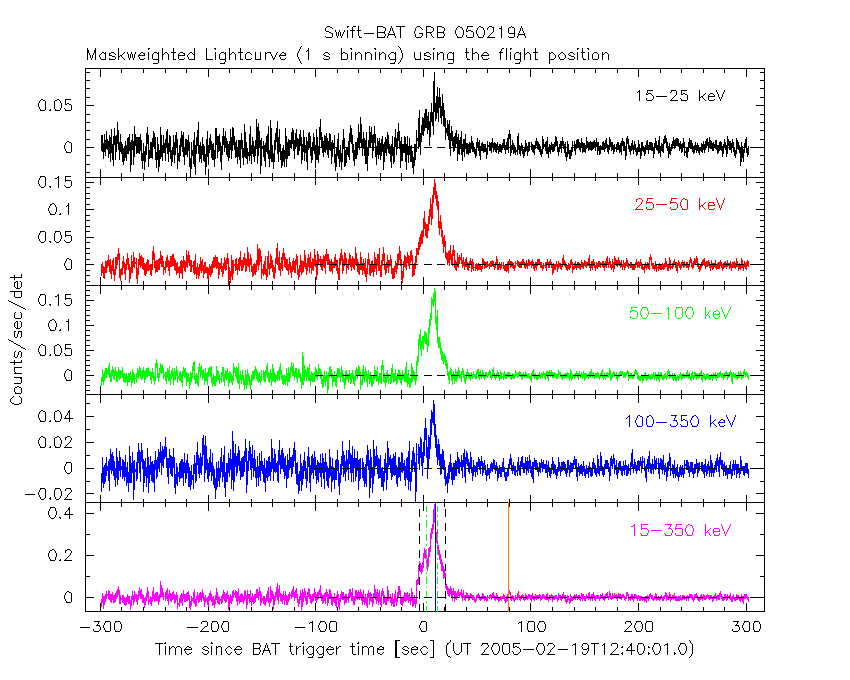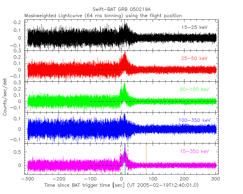 - 4) The verticle lines correspond to following: green dotted lines are T50 interval, black dotted lines are T90 interval, blue solid line(s) is a spacecraft slew start time, and orange solid line(s) is a spacecraft slew end time.