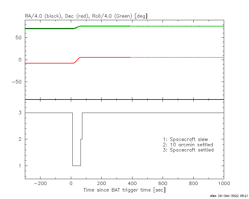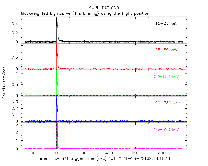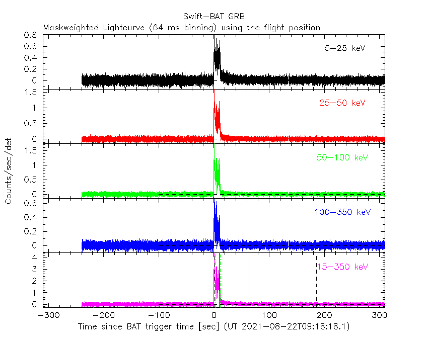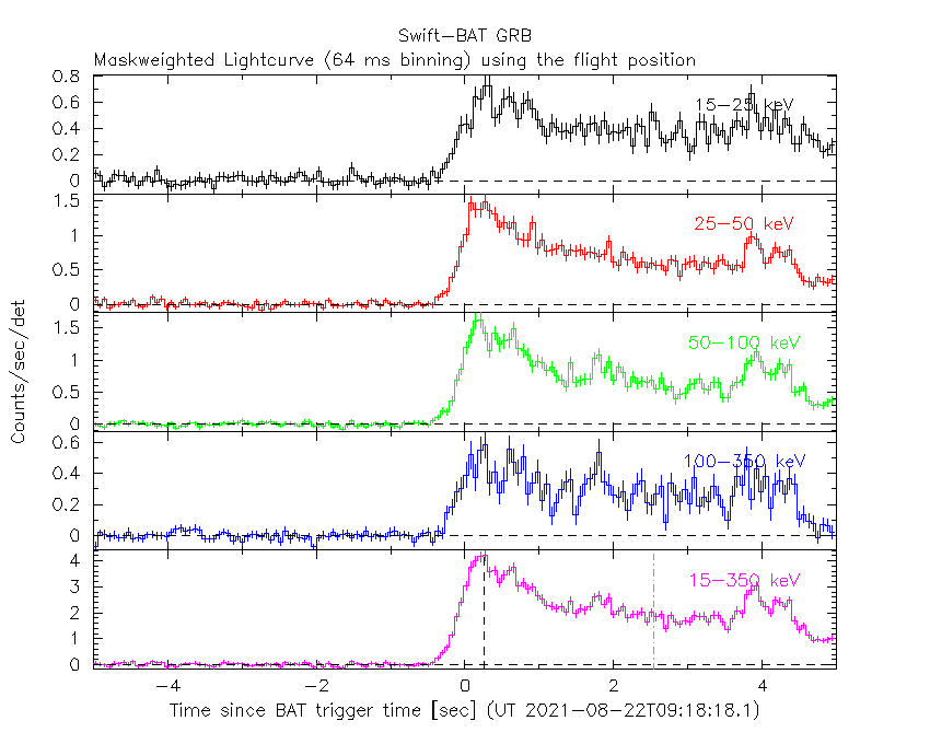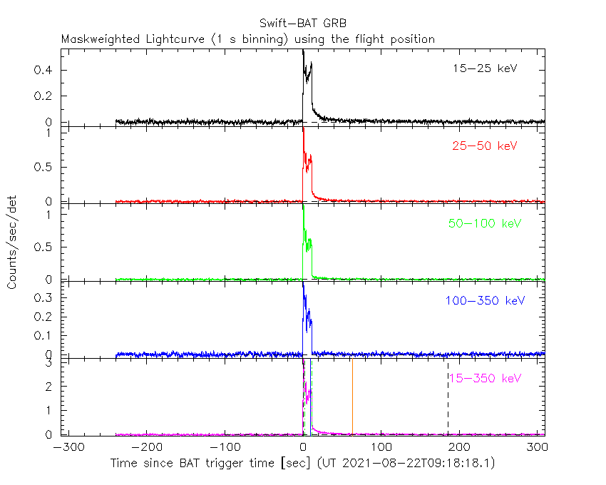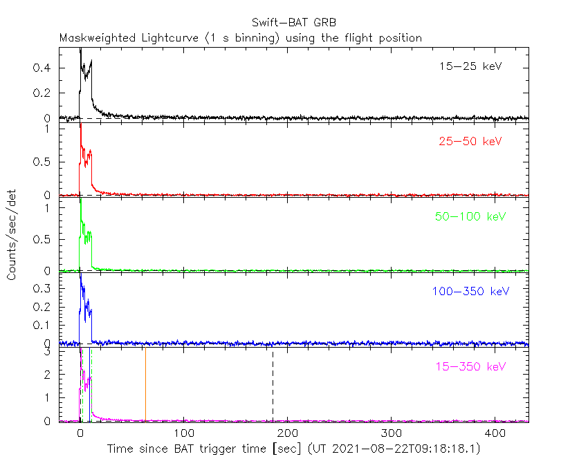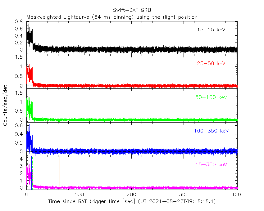 - 4) The verticle lines correspond to following: green dotted lines are T50 interval, black dotted lines are T90 interval, blue solid line(s) is a spacecraft slew start time, and orange solid line(s) is a spacecraft slew end time.