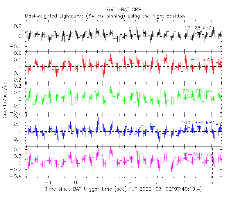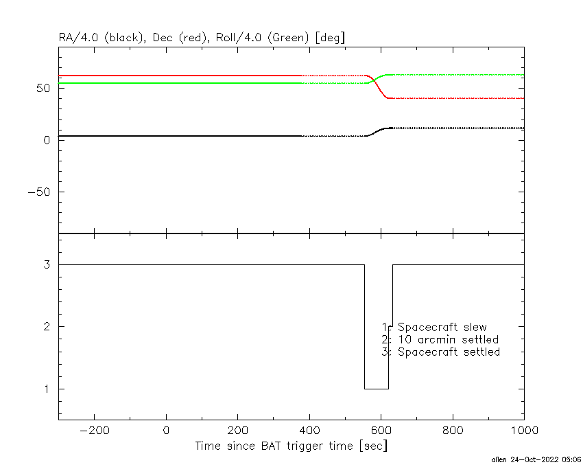 - 4) The verticle lines correspond to following: green dotted lines are T50 interval, black dotted lines are T90 interval, blue solid line(s) is a spacecraft slew start time, and orange solid line(s) is a spacecraft slew end time.