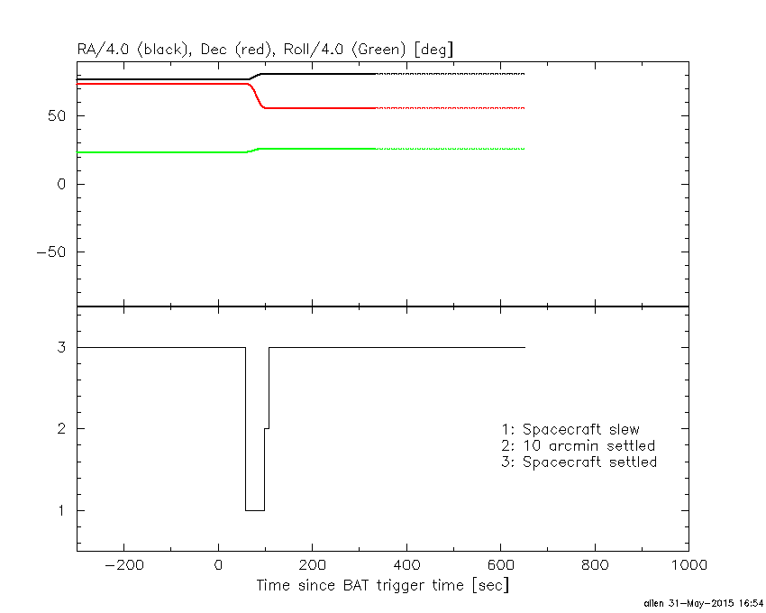 - 4) The verticle lines correspond to following: green dotted lines are T50 interval, black dotted lines are T90 interval, blue solid line(s) is a spacecraft slew start time, and orange solid line(s) is a spacecraft slew end time.