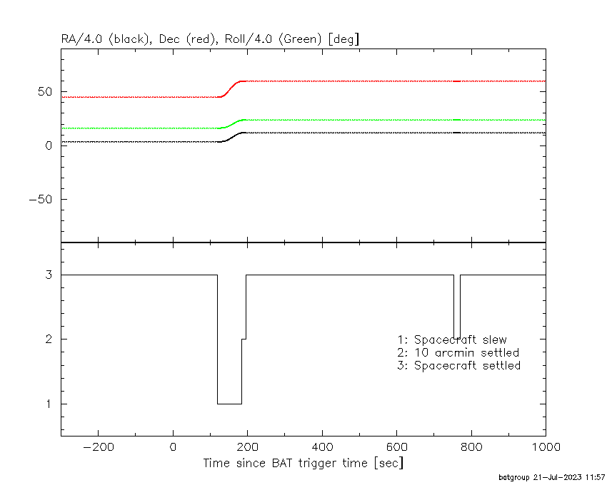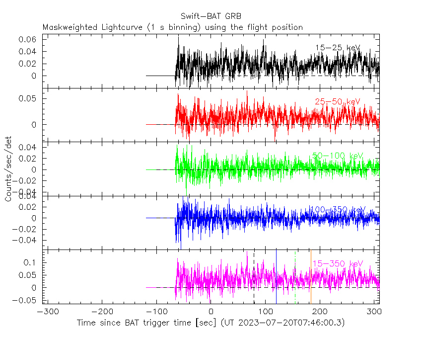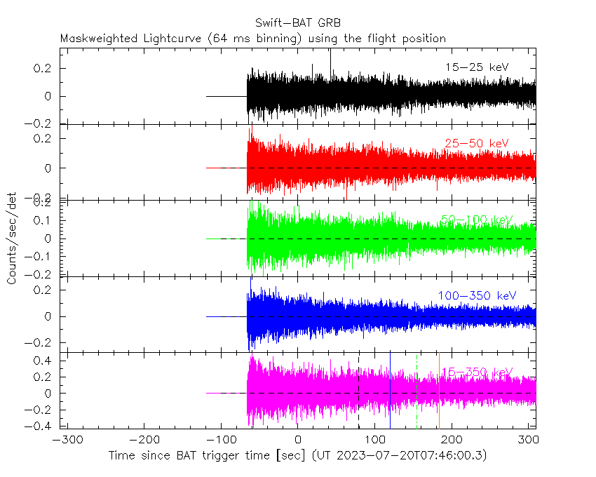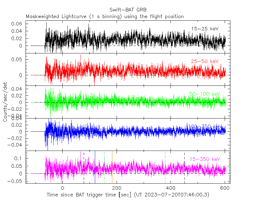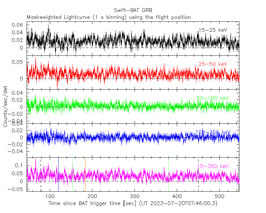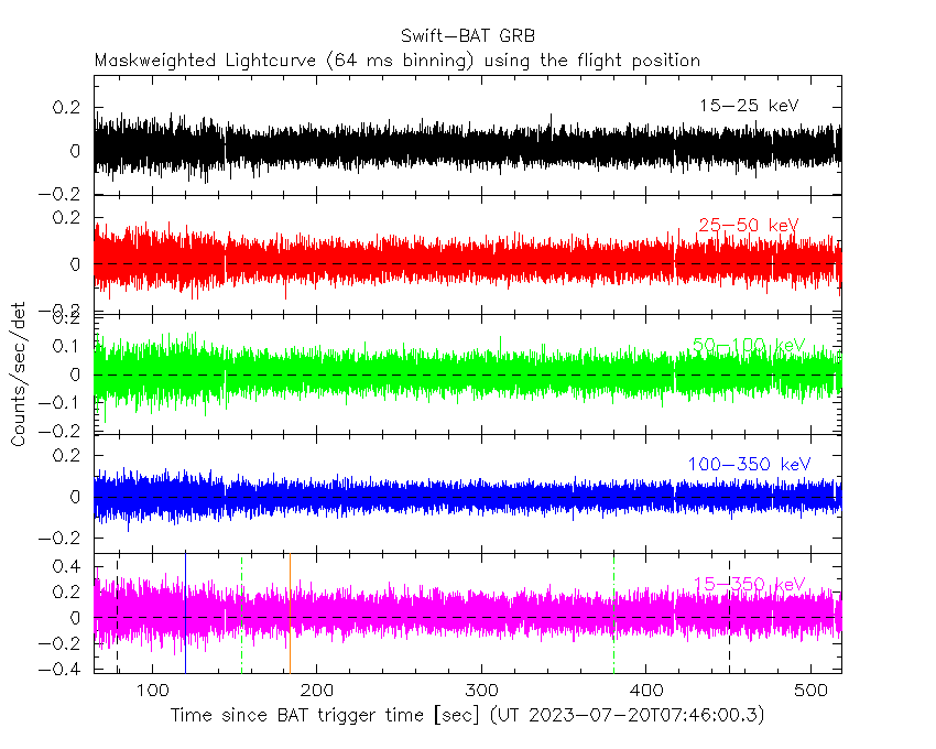 - 5) The verticle lines correspond to following: green dotted lines are T50 interval, black dotted lines are T90 interval, blue solid line(s) is a spacecraft slew start time, and orange solid line(s) is a spacecraft slew end time.