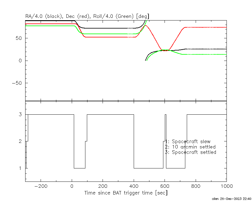 - 4) The verticle lines correspond to following: green dotted lines are T50 interval, black dotted lines are T90 interval, blue solid line(s) is a spacecraft slew start time, and orange solid line(s) is a spacecraft slew end time.