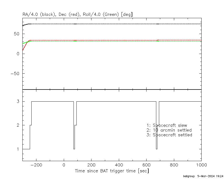 - 5) The verticle lines correspond to following: green dotted lines are T50 interval, black dotted lines are T90 interval, blue solid line(s) is a spacecraft slew start time, and orange solid line(s) is a spacecraft slew end time.