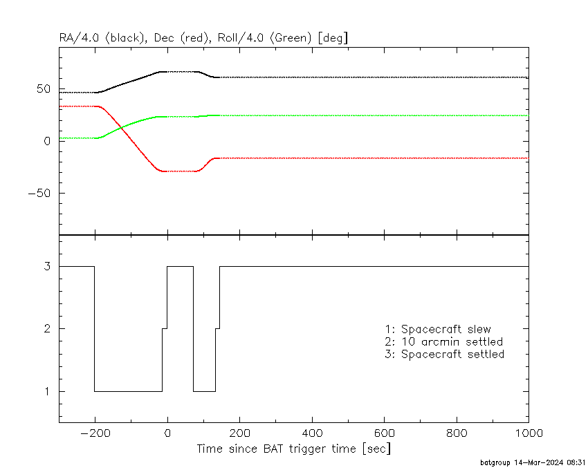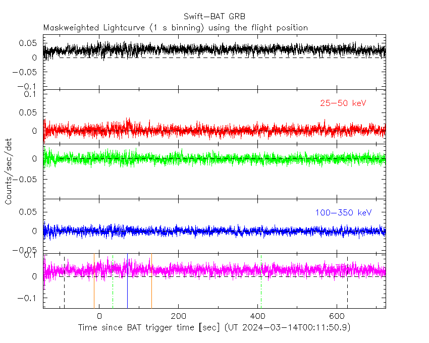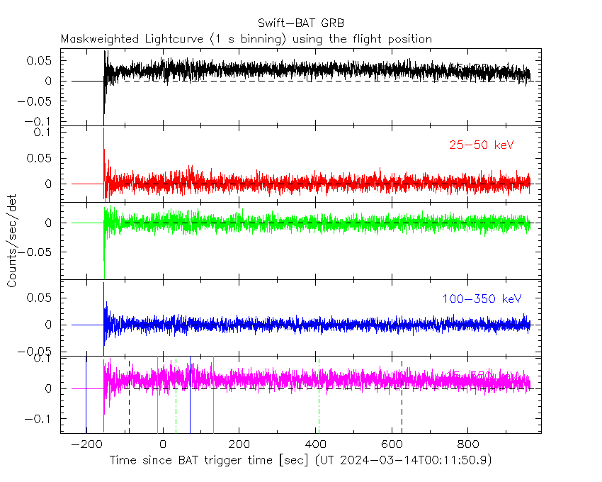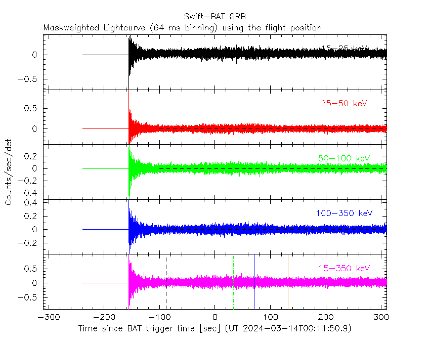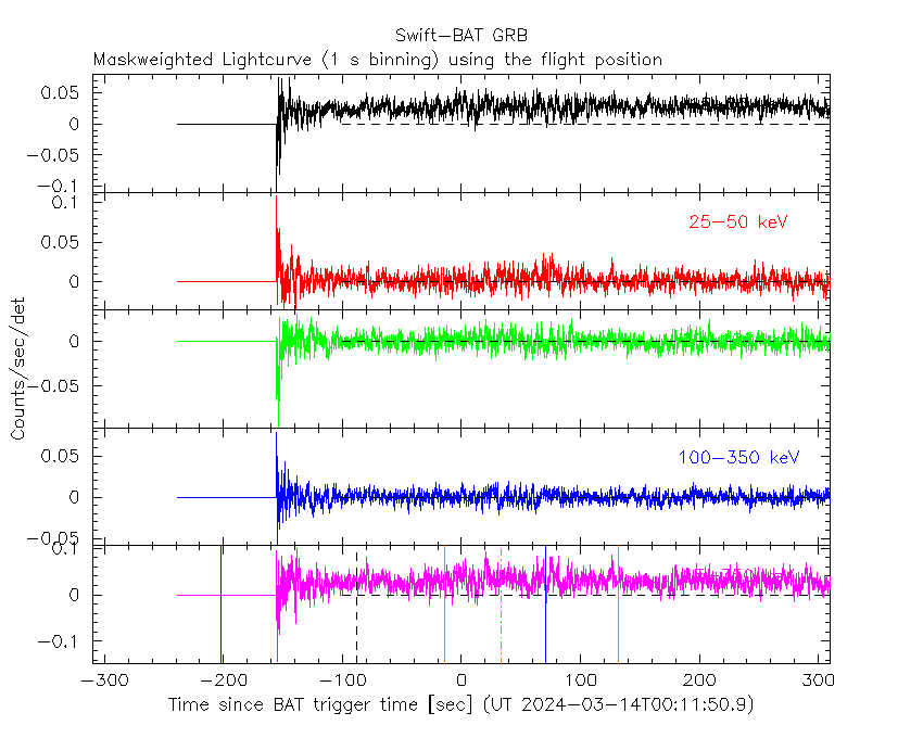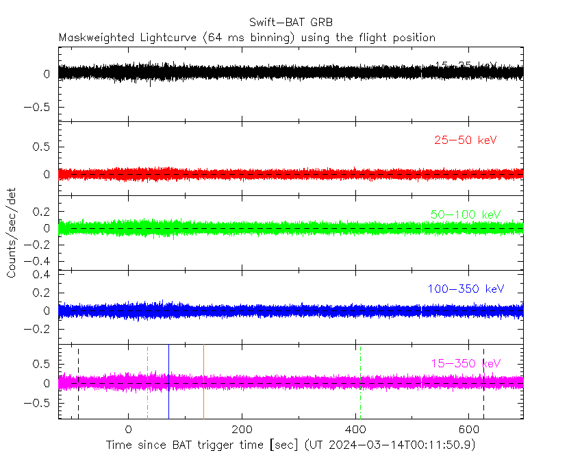 - 5) The verticle lines correspond to following: green dotted lines are T50 interval, black dotted lines are T90 interval, blue solid line(s) is a spacecraft slew start time, and orange solid line(s) is a spacecraft slew end time.