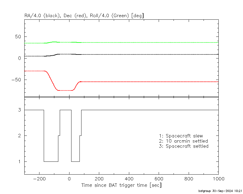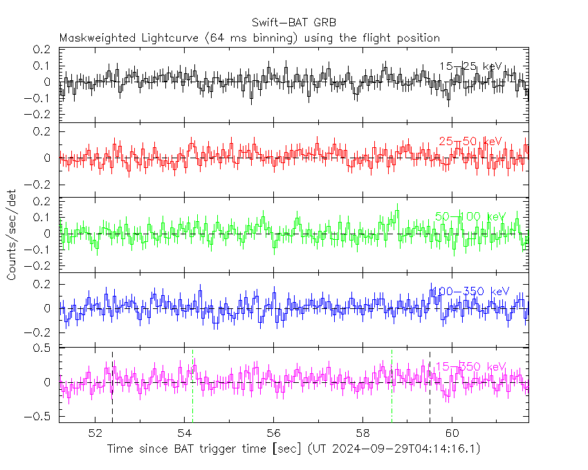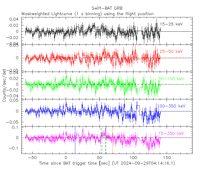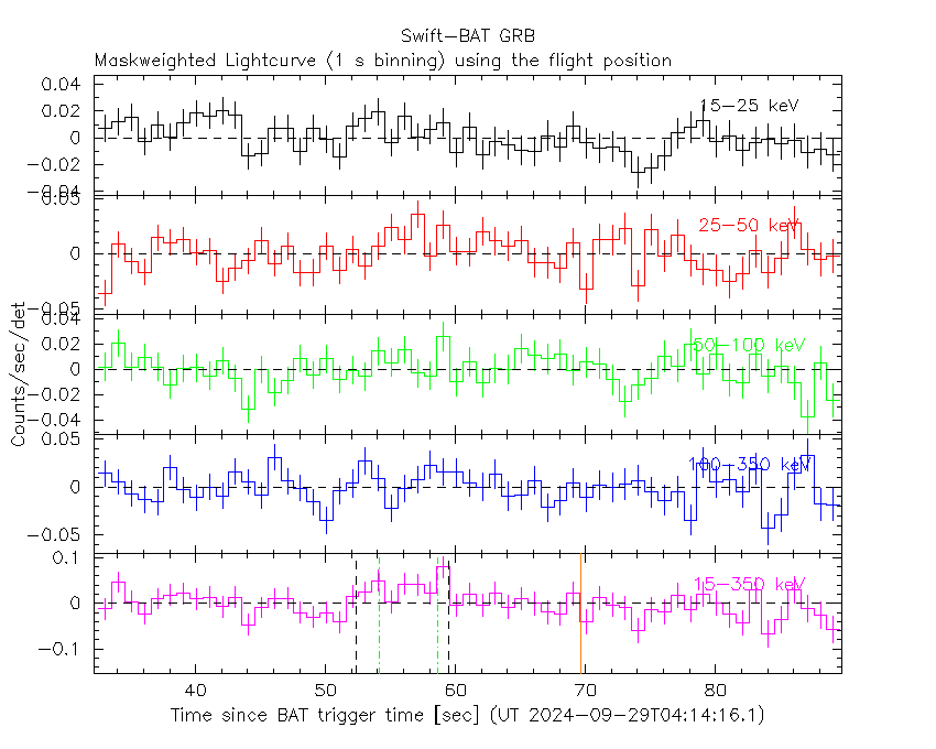 - 5) The verticle lines correspond to following: green dotted lines are T50 interval, black dotted lines are T90 interval, blue solid line(s) is a spacecraft slew start time, and orange solid line(s) is a spacecraft slew end time.