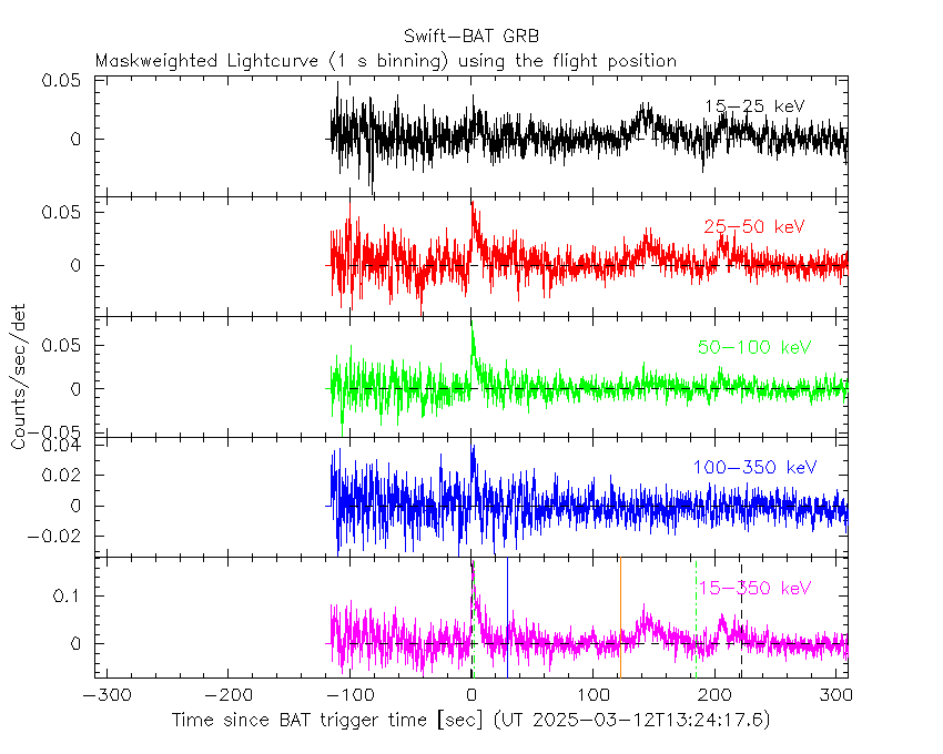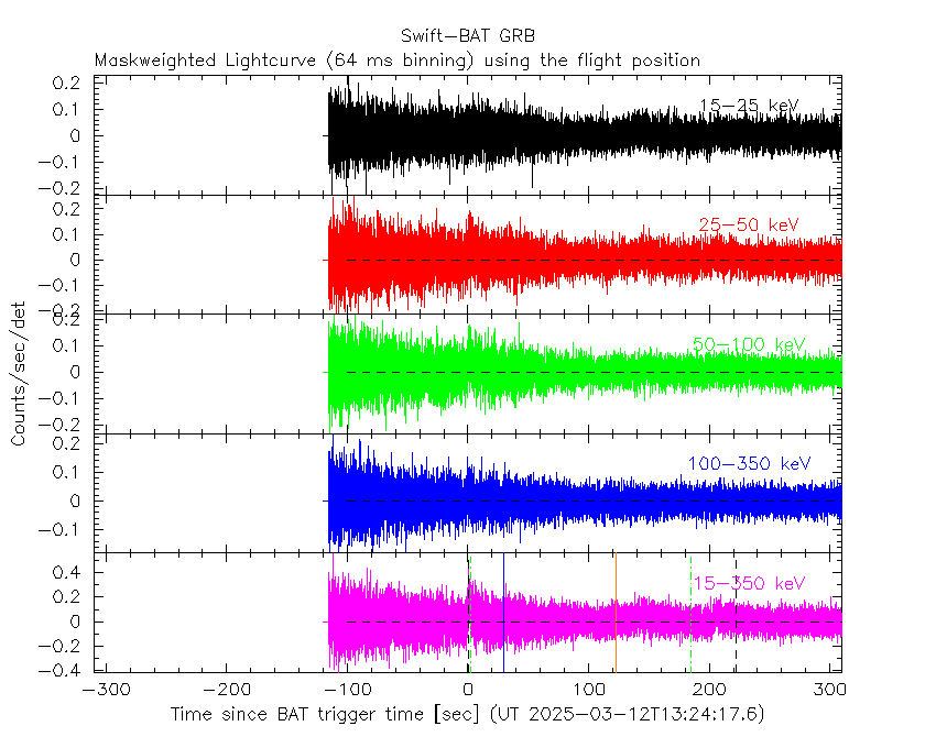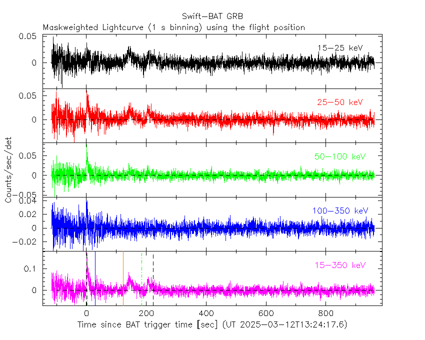 - 4) The verticle lines correspond to following: green dotted lines are T50 interval, black dotted lines are T90 interval, blue solid line(s) is a spacecraft slew start time, and orange solid line(s) is a spacecraft slew end time.