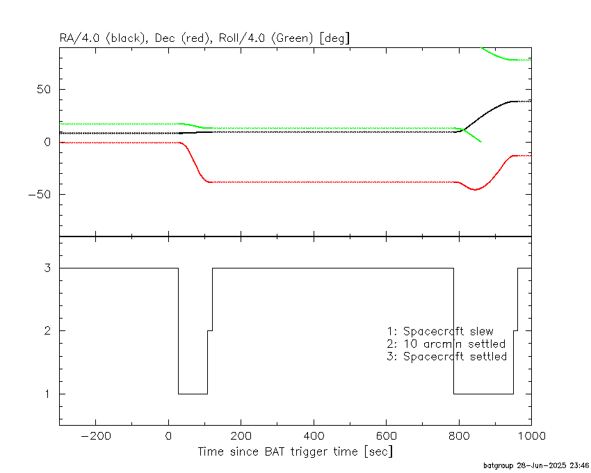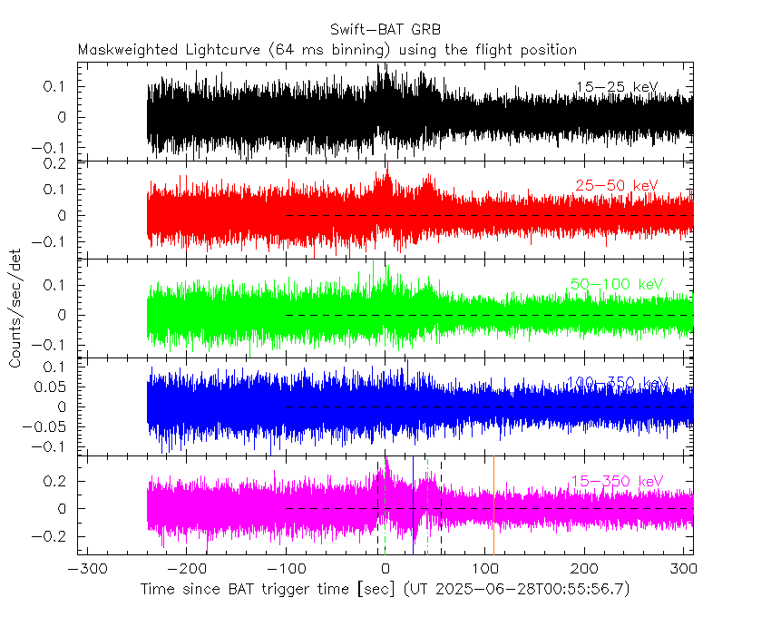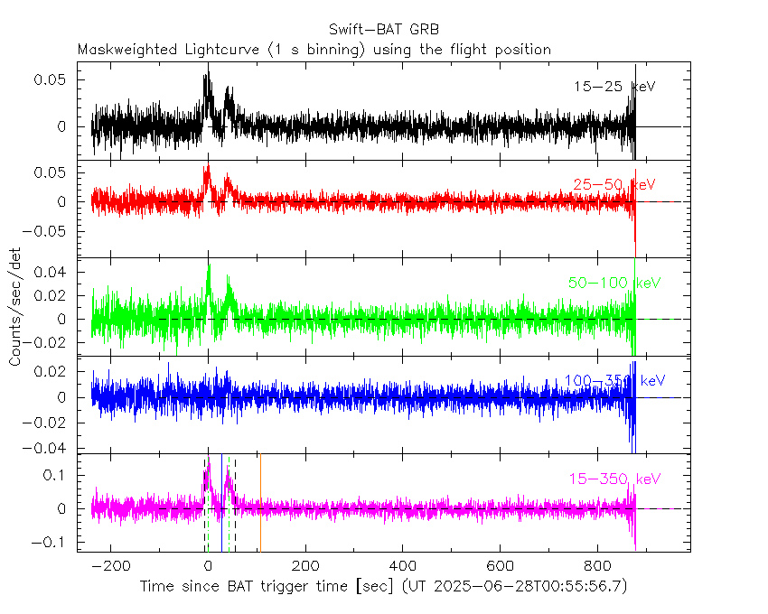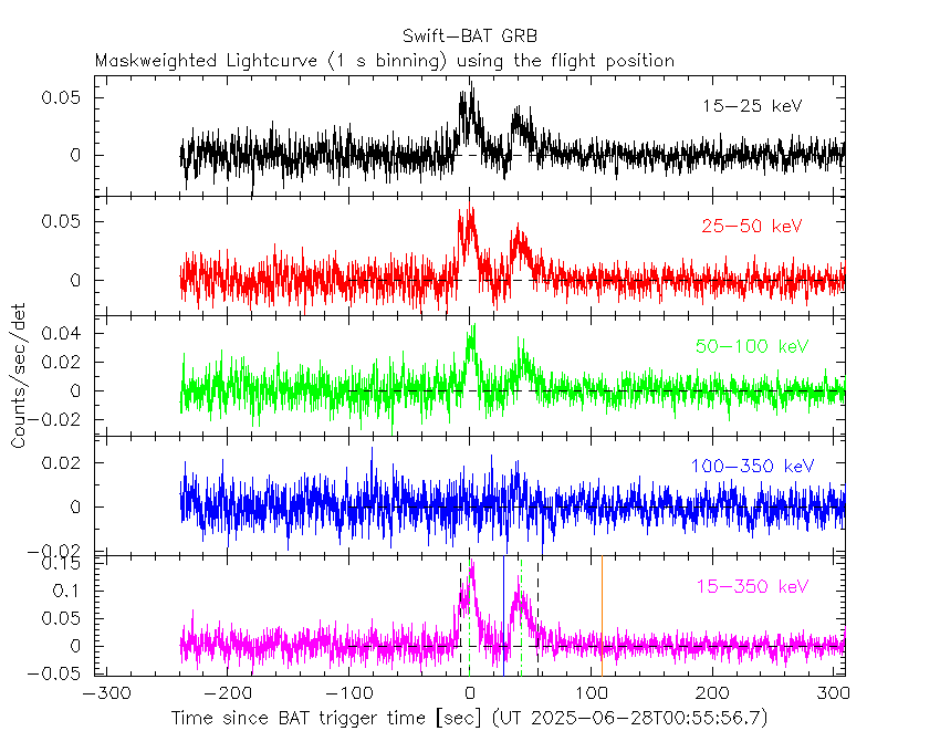 - 5) The verticle lines correspond to following: green dotted lines are T50 interval, black dotted lines are T90 interval, blue solid line(s) is a spacecraft slew start time, and orange solid line(s) is a spacecraft slew end time.