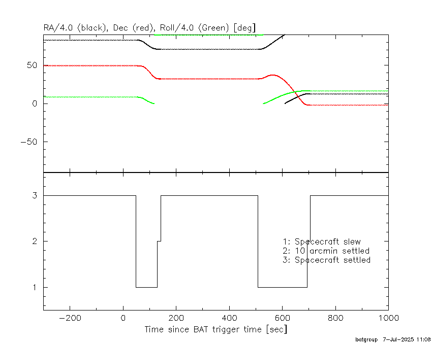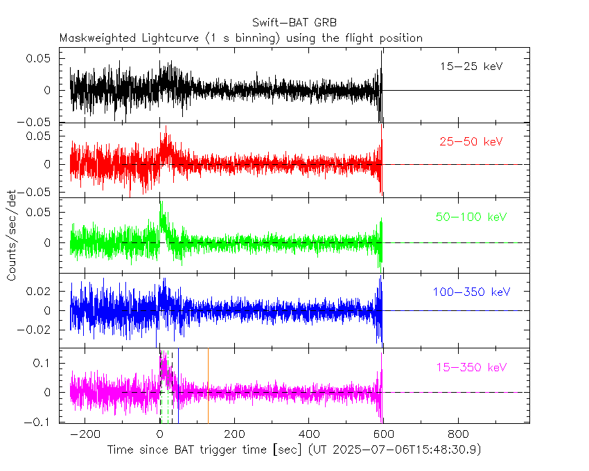 - 5) The verticle lines correspond to following: green dotted lines are T50 interval, black dotted lines are T90 interval, blue solid line(s) is a spacecraft slew start time, and orange solid line(s) is a spacecraft slew end time.