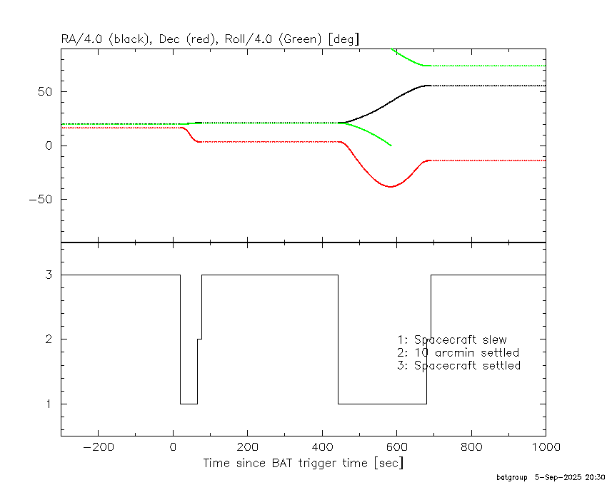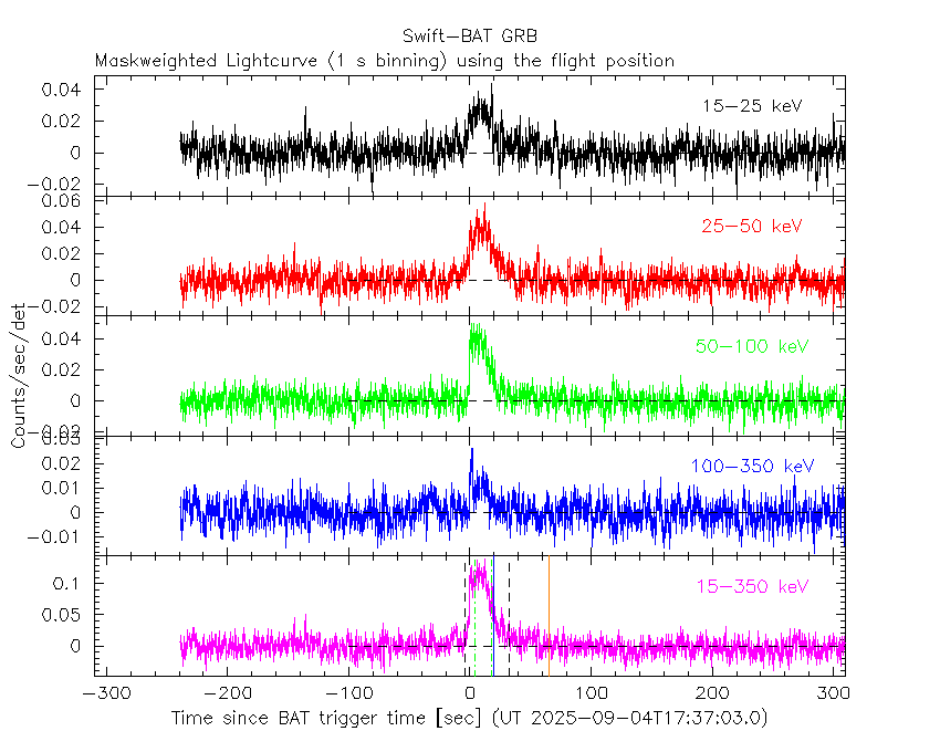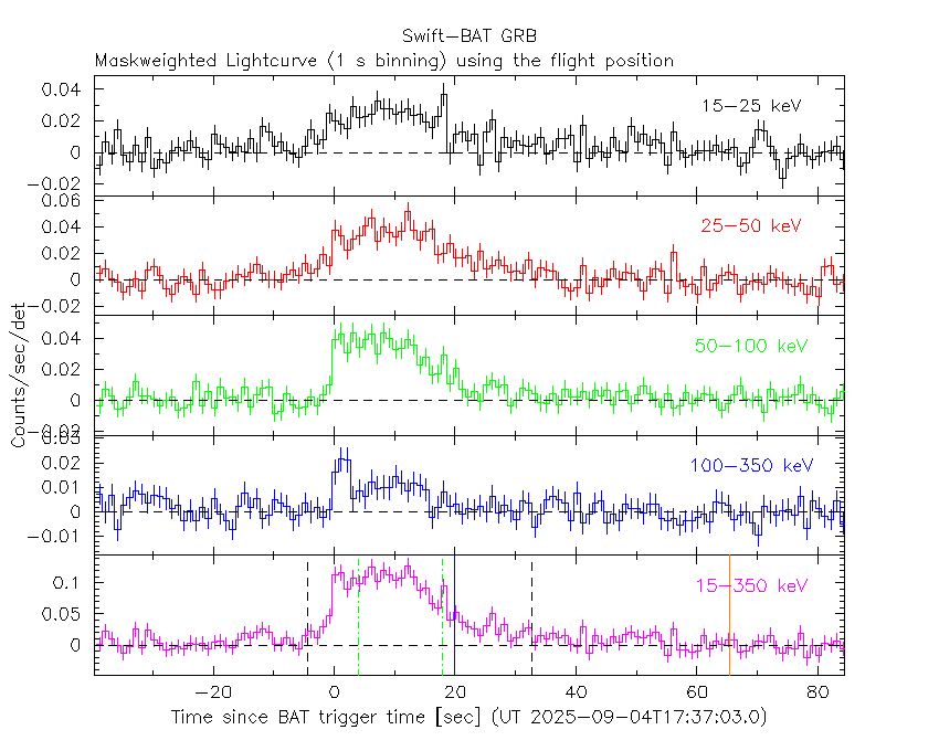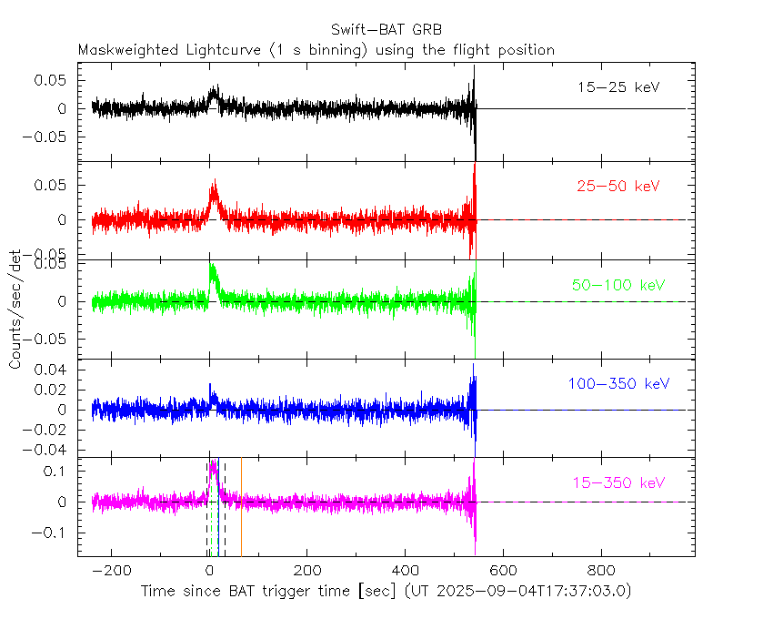- 5) The verticle lines correspond to following: green dotted lines are T50 interval, black dotted lines are T90 interval, blue solid line(s) is a spacecraft slew start time, and orange solid line(s) is a spacecraft slew end time.