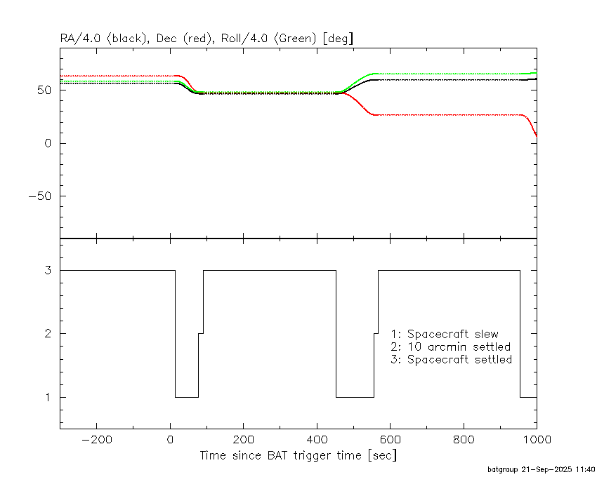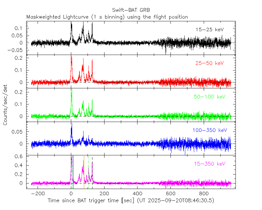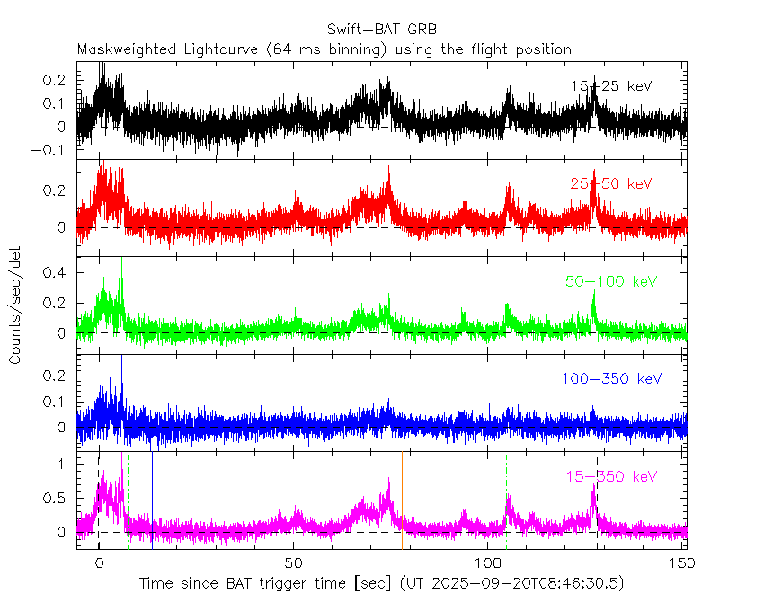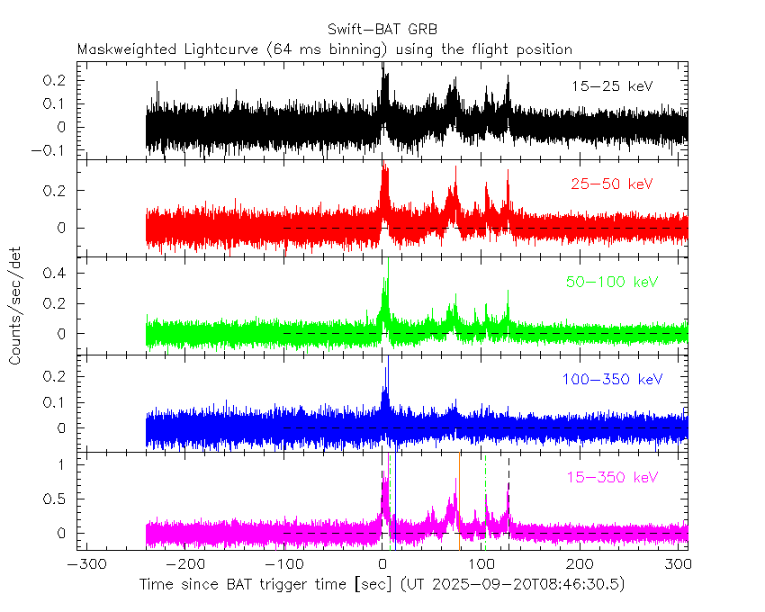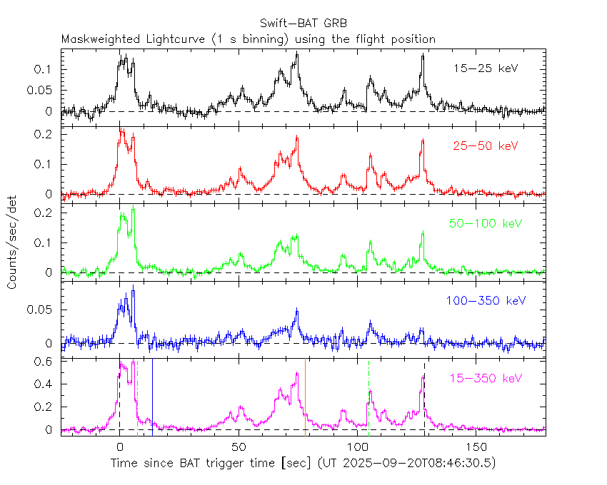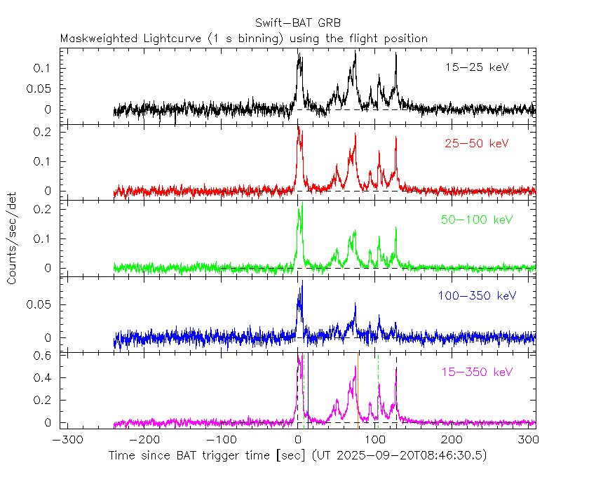 - 5) The verticle lines correspond to following: green dotted lines are T50 interval, black dotted lines are T90 interval, blue solid line(s) is a spacecraft slew start time, and orange solid line(s) is a spacecraft slew end time.