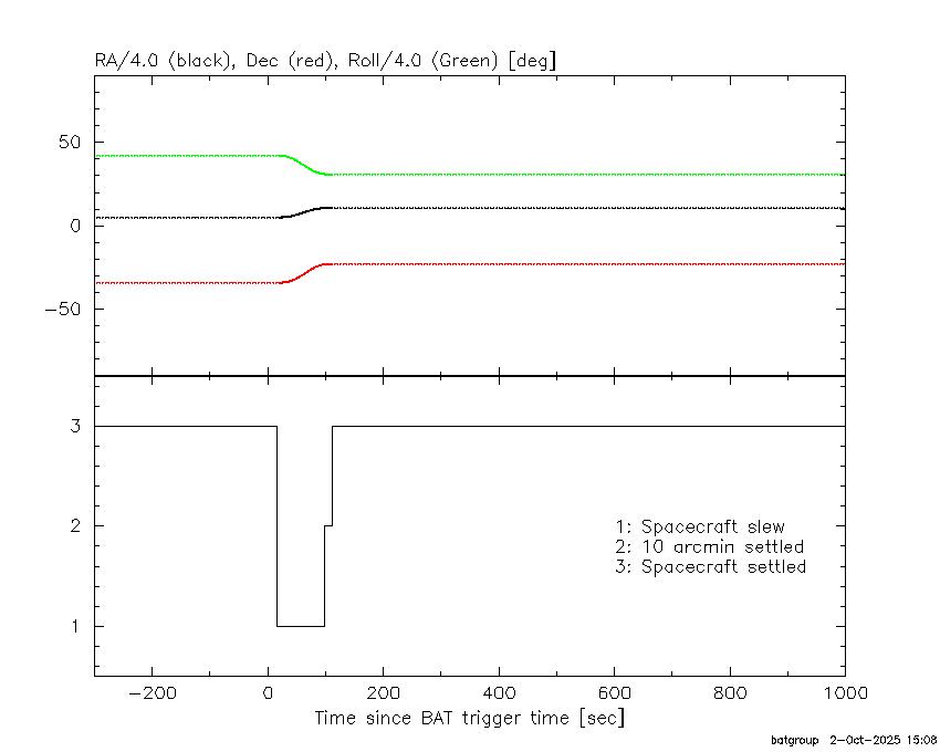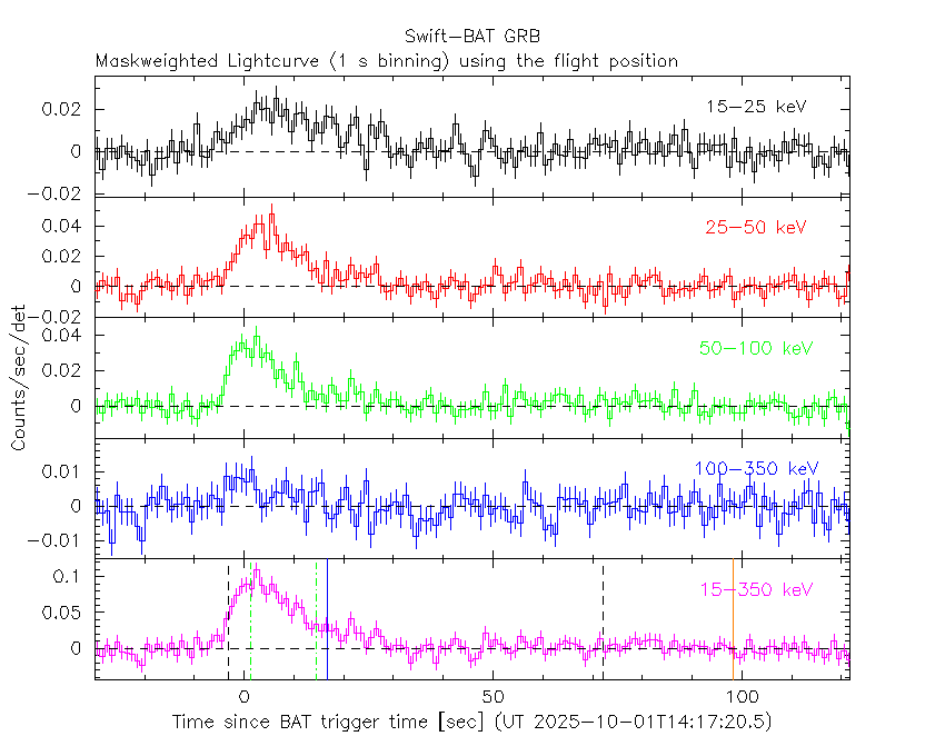 - 5) The verticle lines correspond to following: green dotted lines are T50 interval, black dotted lines are T90 interval, blue solid line(s) is a spacecraft slew start time, and orange solid line(s) is a spacecraft slew end time.