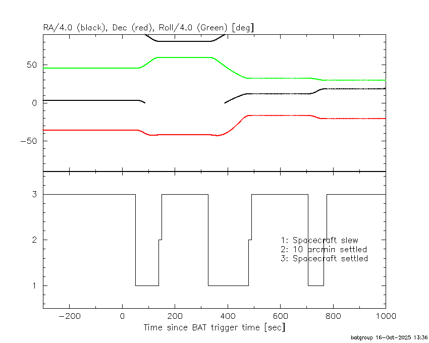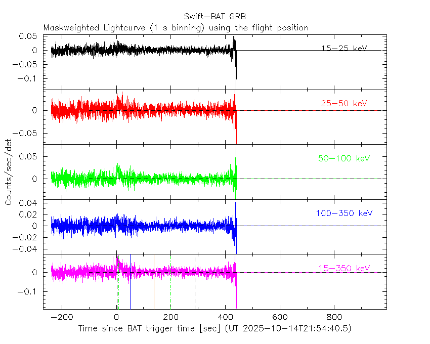 - 5) The verticle lines correspond to following: green dotted lines are T50 interval, black dotted lines are T90 interval, blue solid line(s) is a spacecraft slew start time, and orange solid line(s) is a spacecraft slew end time.