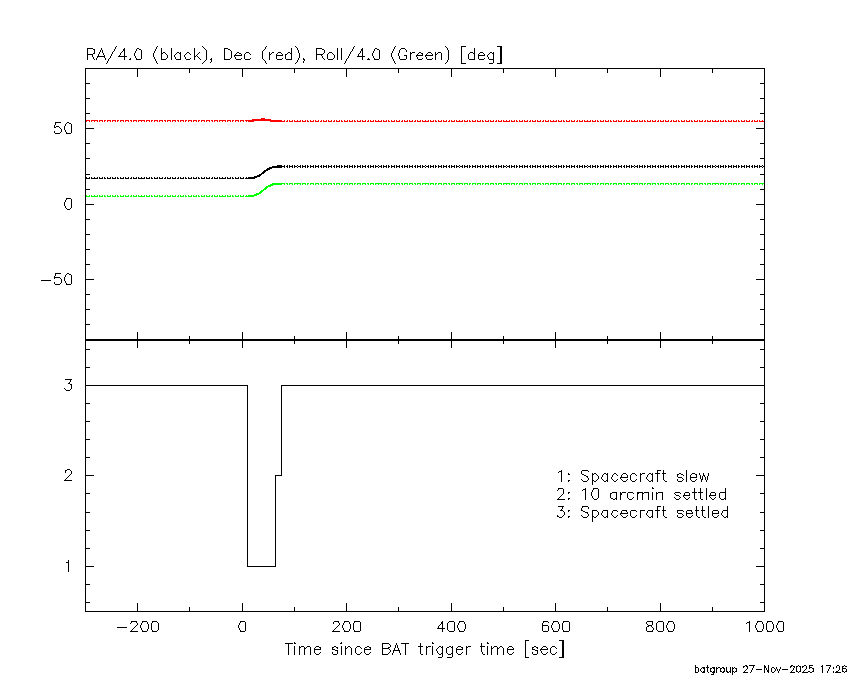 - 5) The verticle lines correspond to following: green dotted lines are T50 interval, black dotted lines are T90 interval, blue solid line(s) is a spacecraft slew start time, and orange solid line(s) is a spacecraft slew end time.