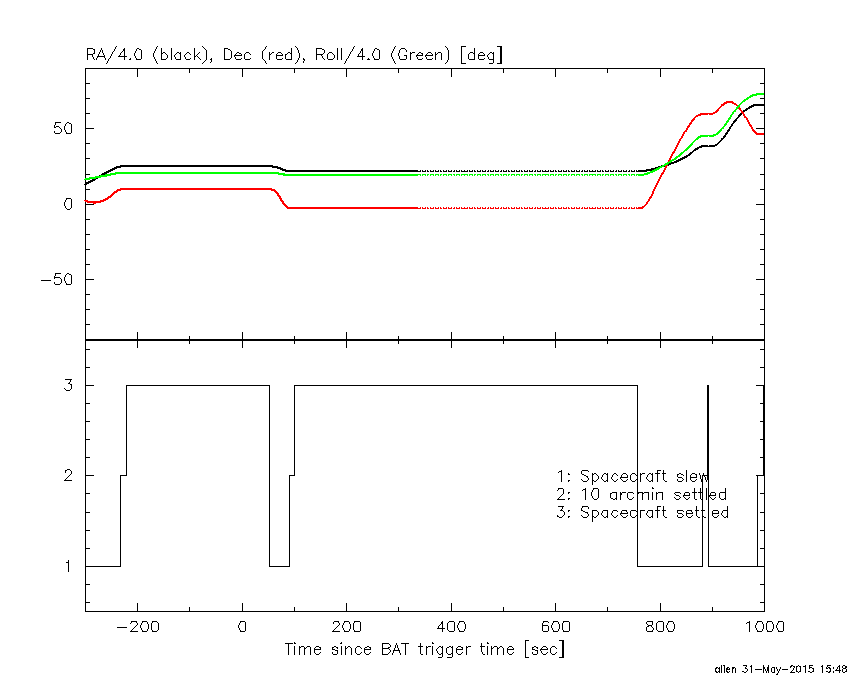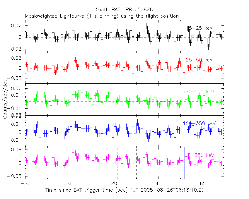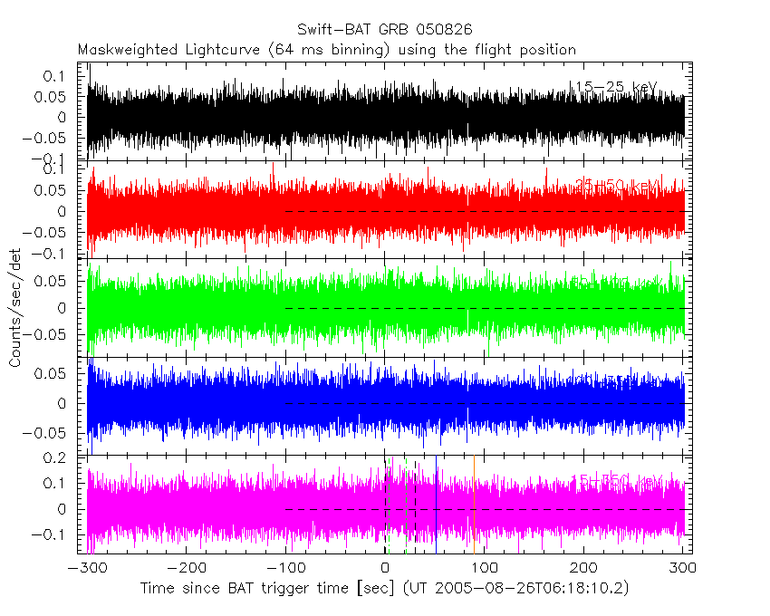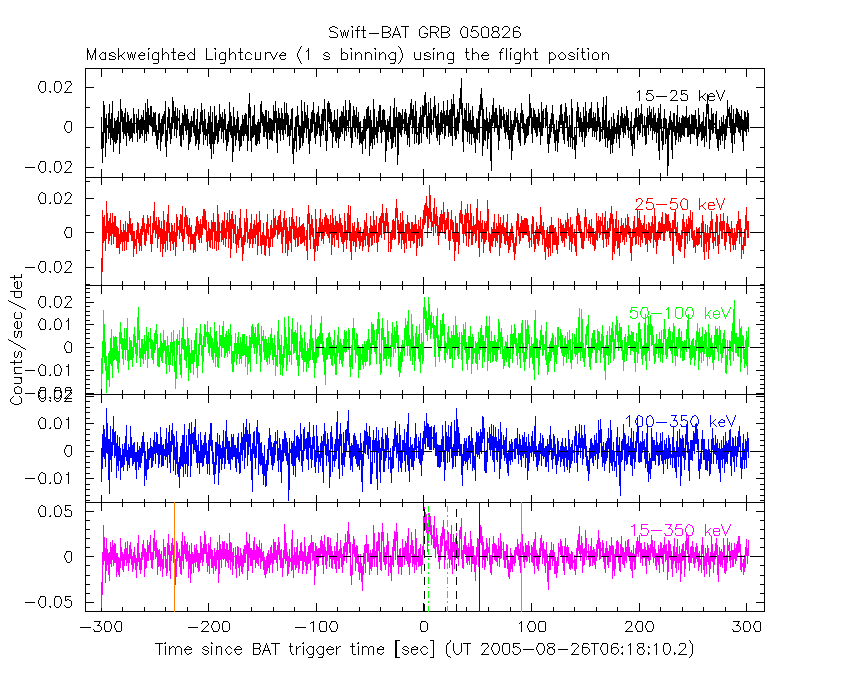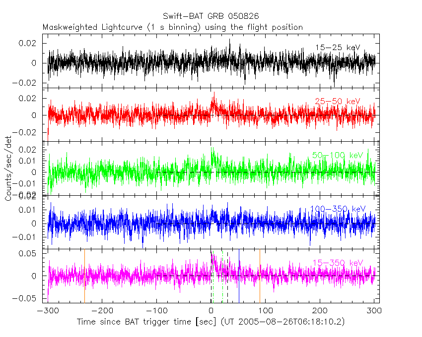 - 4) The verticle lines correspond to following: green dotted lines are T50 interval, black dotted lines are T90 interval, blue solid line(s) is a spacecraft slew start time, and orange solid line(s) is a spacecraft slew end time.