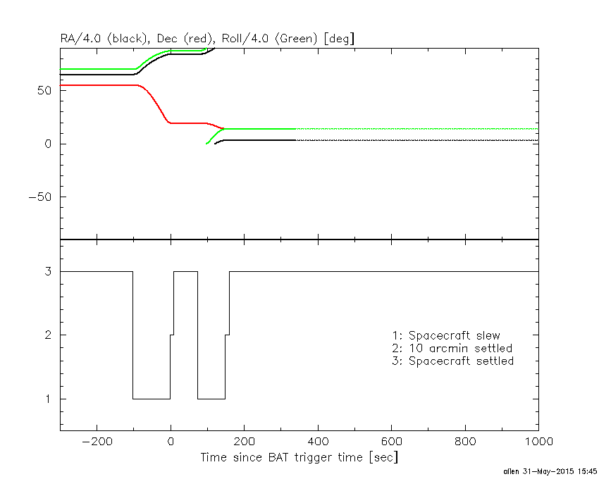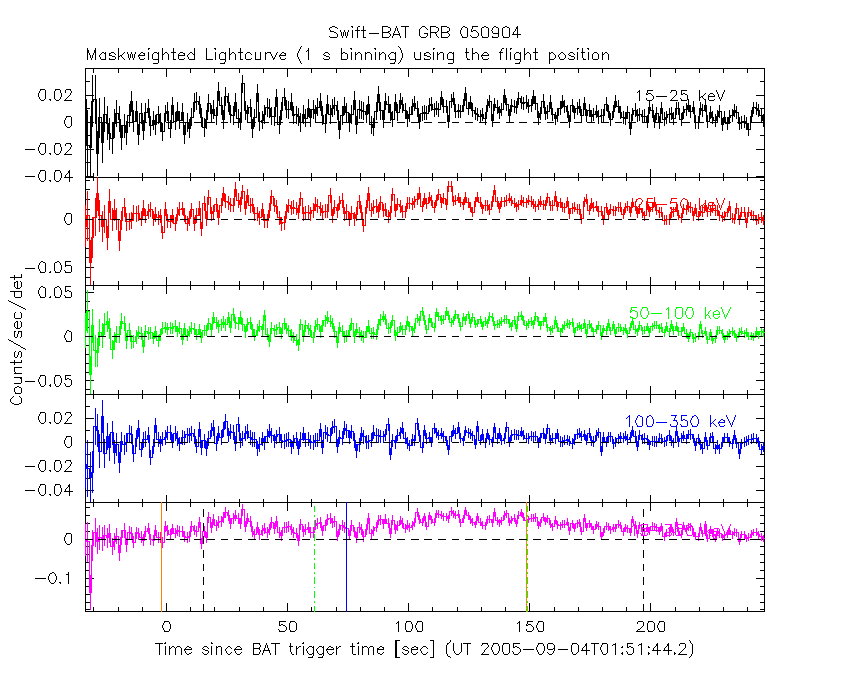 - 4) The verticle lines correspond to following: green dotted lines are T50 interval, black dotted lines are T90 interval, blue solid line(s) is a spacecraft slew start time, and orange solid line(s) is a spacecraft slew end time.