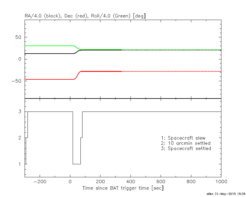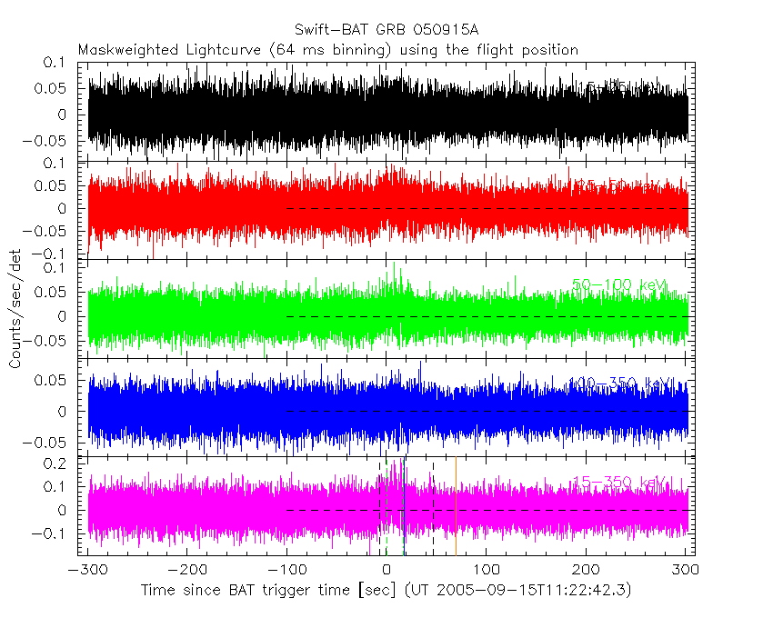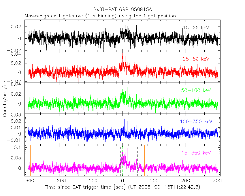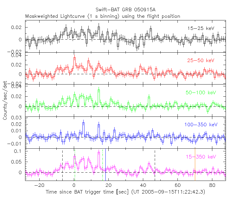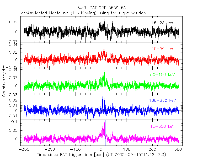 - 4) The verticle lines correspond to following: green dotted lines are T50 interval, black dotted lines are T90 interval, blue solid line(s) is a spacecraft slew start time, and orange solid line(s) is a spacecraft slew end time.