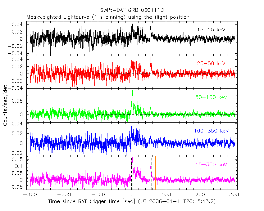 - 4) The verticle lines correspond to following: green dotted lines are T50 interval, black dotted lines are T90 interval, blue solid line(s) is a spacecraft slew start time, and orange solid line(s) is a spacecraft slew end time.