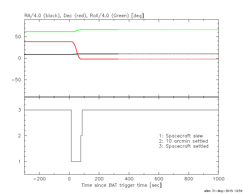- 4) The verticle lines correspond to following: green dotted lines are T50 interval, black dotted lines are T90 interval, blue solid line(s) is a spacecraft slew start time, and orange solid line(s) is a spacecraft slew end time.