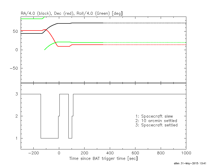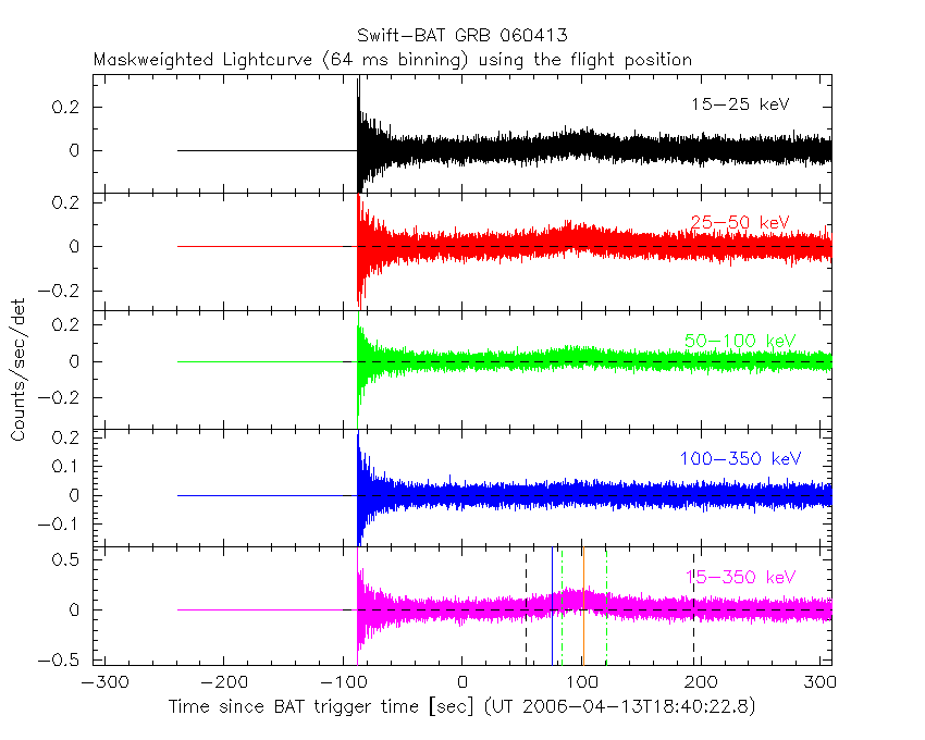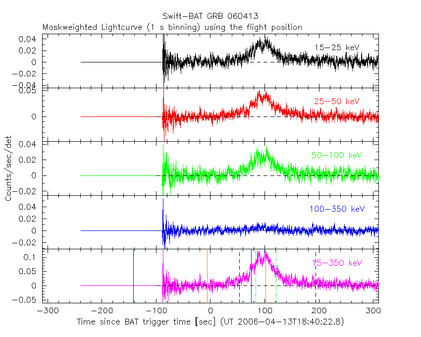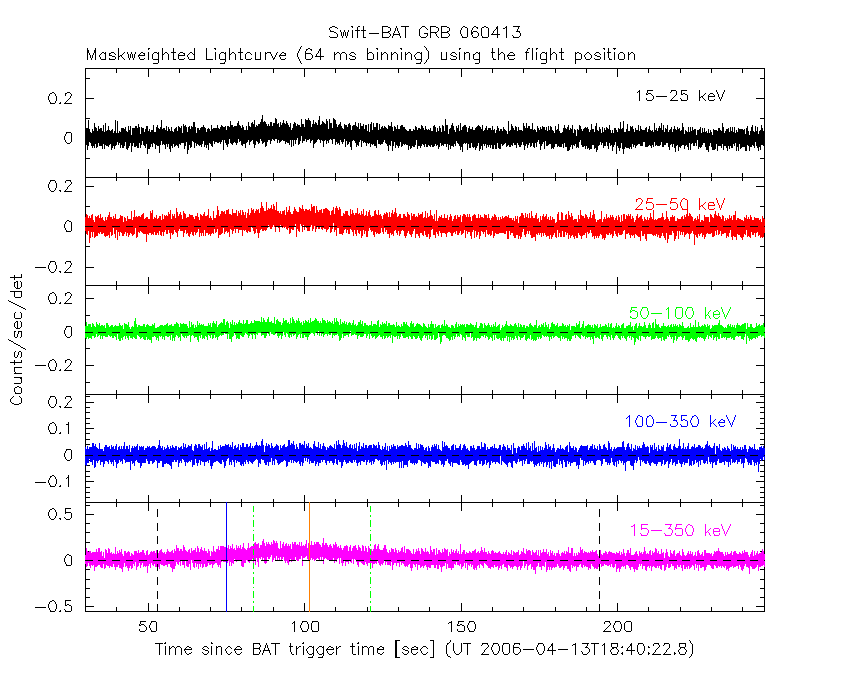 - 4) The verticle lines correspond to following: green dotted lines are T50 interval, black dotted lines are T90 interval, blue solid line(s) is a spacecraft slew start time, and orange solid line(s) is a spacecraft slew end time.