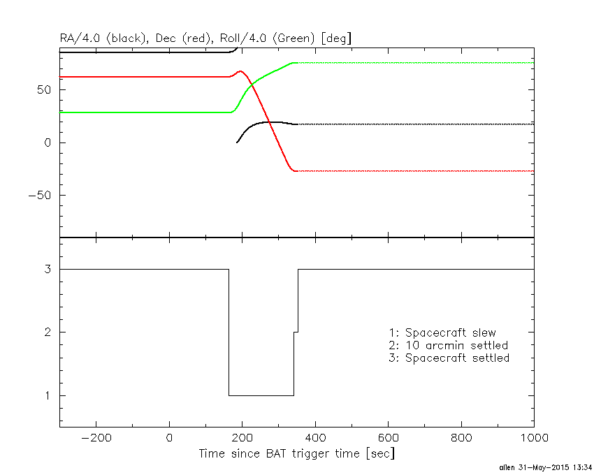 - 4) The verticle lines correspond to following: green dotted lines are T50 interval, black dotted lines are T90 interval, blue solid line(s) is a spacecraft slew start time, and orange solid line(s) is a spacecraft slew end time.