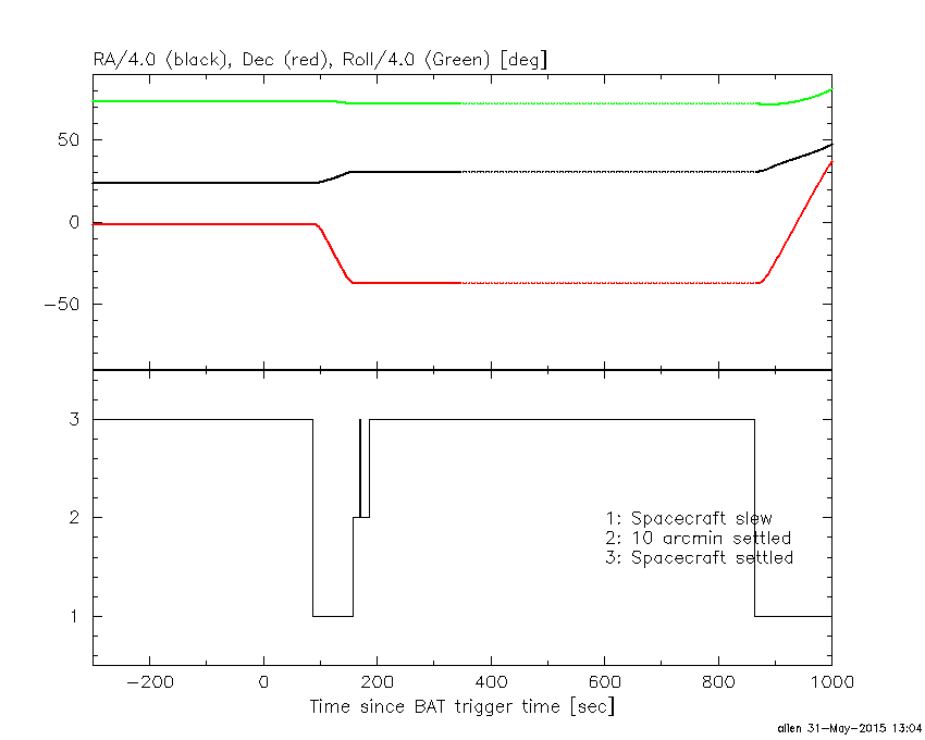 - 4) The verticle lines correspond to following: green dotted lines are T50 interval, black dotted lines are T90 interval, blue solid line(s) is a spacecraft slew start time, and orange solid line(s) is a spacecraft slew end time.