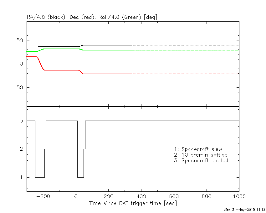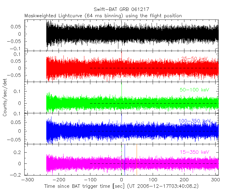 - 4) The verticle lines correspond to following: green dotted lines are T50 interval, black dotted lines are T90 interval, blue solid line(s) is a spacecraft slew start time, and orange solid line(s) is a spacecraft slew end time.