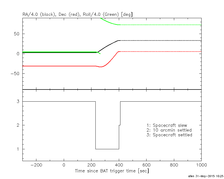 - 4) The verticle lines correspond to following: green dotted lines are T50 interval, black dotted lines are T90 interval, blue solid line(s) is a spacecraft slew start time, and orange solid line(s) is a spacecraft slew end time.