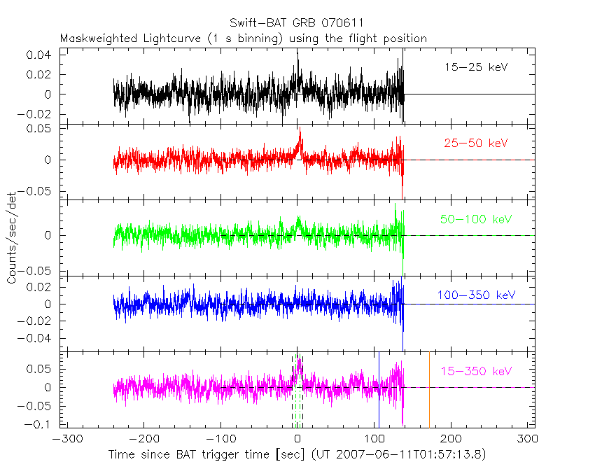 - 4) The verticle lines correspond to following: green dotted lines are T50 interval, black dotted lines are T90 interval, blue solid line(s) is a spacecraft slew start time, and orange solid line(s) is a spacecraft slew end time.
