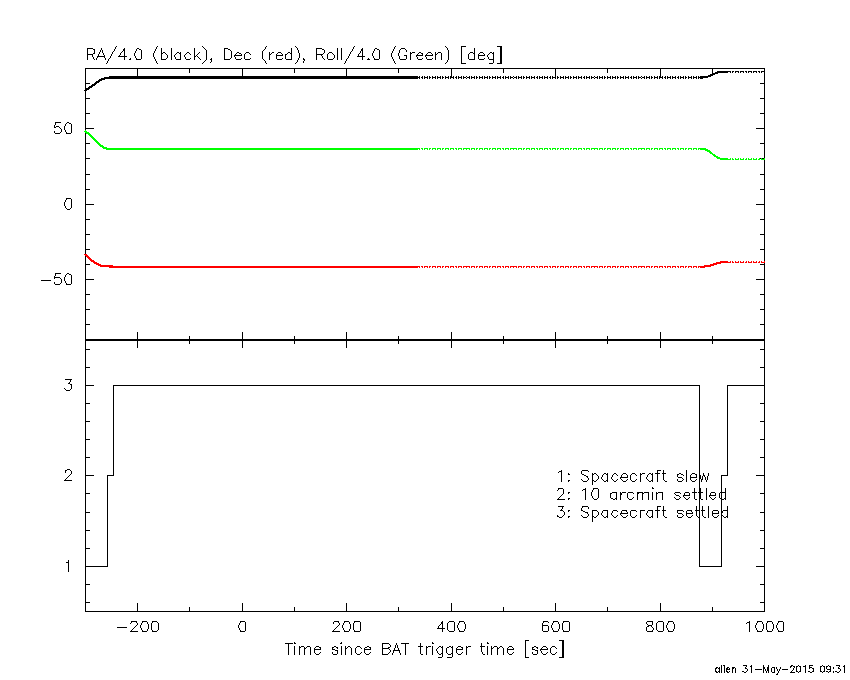 - 4) The verticle lines correspond to following: green dotted lines are T50 interval, black dotted lines are T90 interval, blue solid line(s) is a spacecraft slew start time, and orange solid line(s) is a spacecraft slew end time.