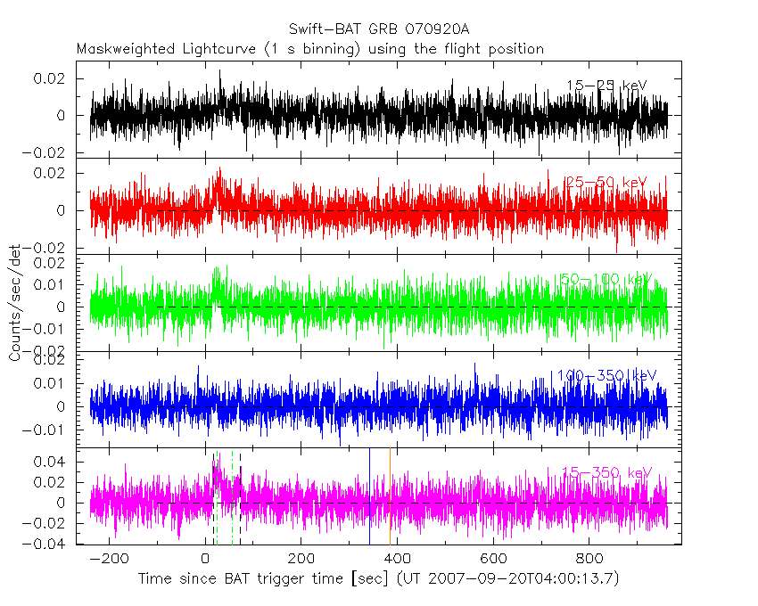 - 4) The verticle lines correspond to following: green dotted lines are T50 interval, black dotted lines are T90 interval, blue solid line(s) is a spacecraft slew start time, and orange solid line(s) is a spacecraft slew end time.