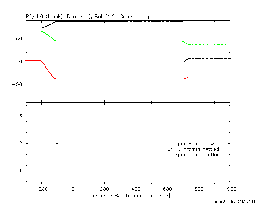 - 4) The verticle lines correspond to following: green dotted lines are T50 interval, black dotted lines are T90 interval, blue solid line(s) is a spacecraft slew start time, and orange solid line(s) is a spacecraft slew end time.