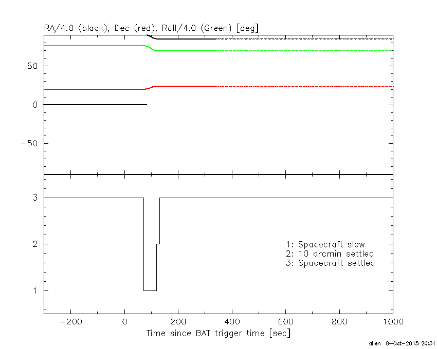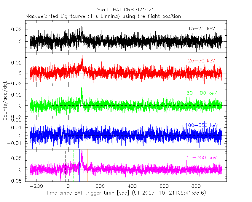 - 4) The verticle lines correspond to following: green dotted lines are T50 interval, black dotted lines are T90 interval, blue solid line(s) is a spacecraft slew start time, and orange solid line(s) is a spacecraft slew end time.