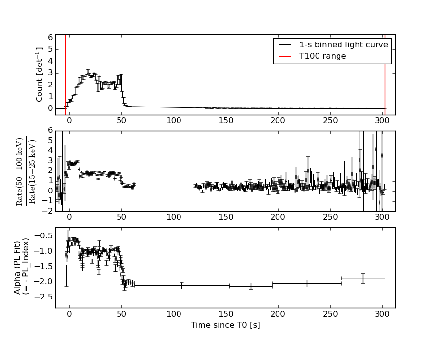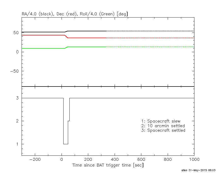 - 4) The verticle lines correspond to following: green dotted lines are T50 interval, black dotted lines are T90 interval, blue solid line(s) is a spacecraft slew start time, and orange solid line(s) is a spacecraft slew end time.