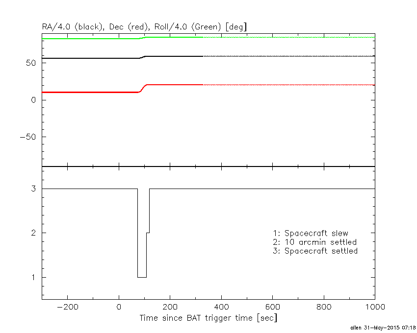 - 4) The verticle lines correspond to following: green dotted lines are T50 interval, black dotted lines are T90 interval, blue solid line(s) is a spacecraft slew start time, and orange solid line(s) is a spacecraft slew end time.