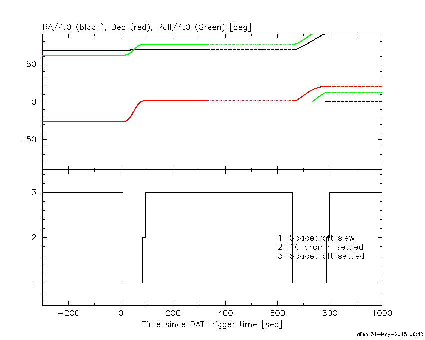 - 4) The verticle lines correspond to following: green dotted lines are T50 interval, black dotted lines are T90 interval, blue solid line(s) is a spacecraft slew start time, and orange solid line(s) is a spacecraft slew end time.