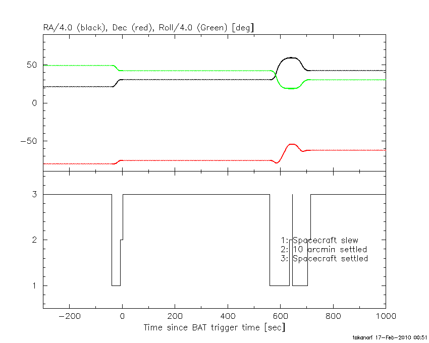 - 4) The verticle lines correspond to following: green dotted lines are T50 interval, black dotted lines are T90 interval, blue solid line(s) is a spacecraft slew start time, and orange solid line(s) is a spacecraft slew end time.