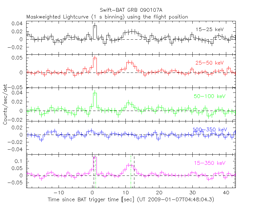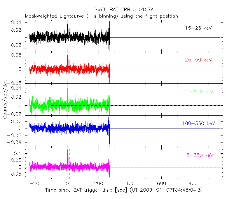 - 4) The verticle lines correspond to following: green dotted lines are T50 interval, black dotted lines are T90 interval, blue solid line(s) is a spacecraft slew start time, and orange solid line(s) is a spacecraft slew end time.