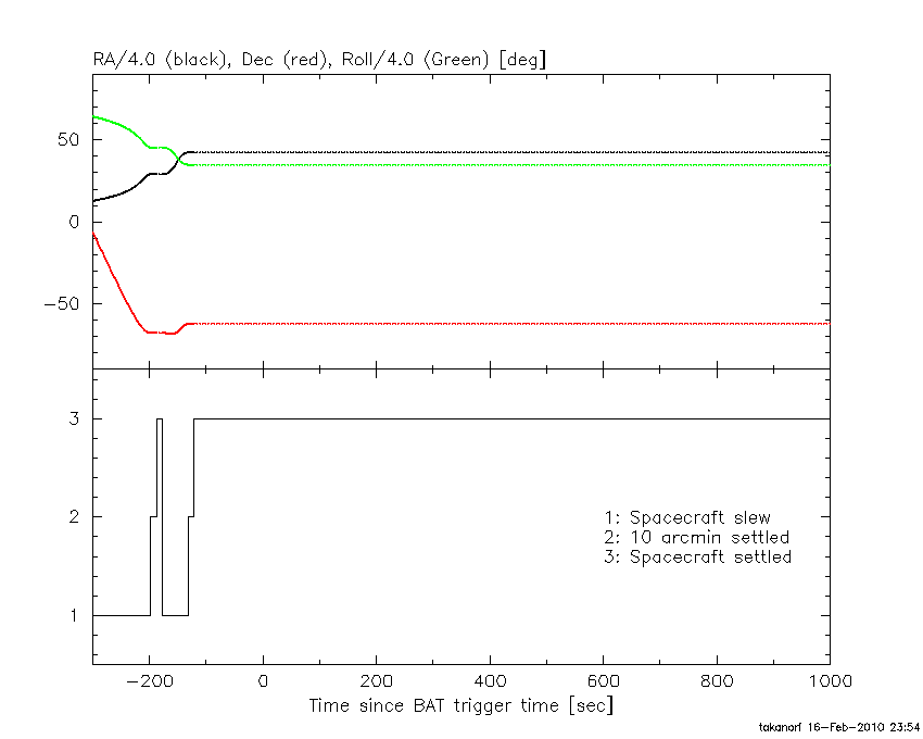 - 4) The verticle lines correspond to following: green dotted lines are T50 interval, black dotted lines are T90 interval, blue solid line(s) is a spacecraft slew start time, and orange solid line(s) is a spacecraft slew end time.
