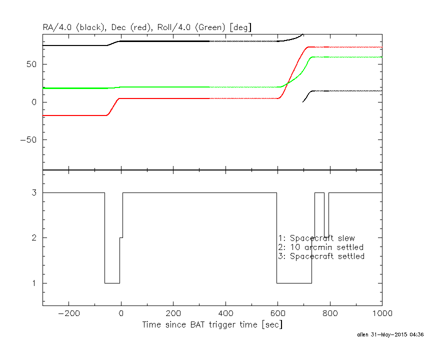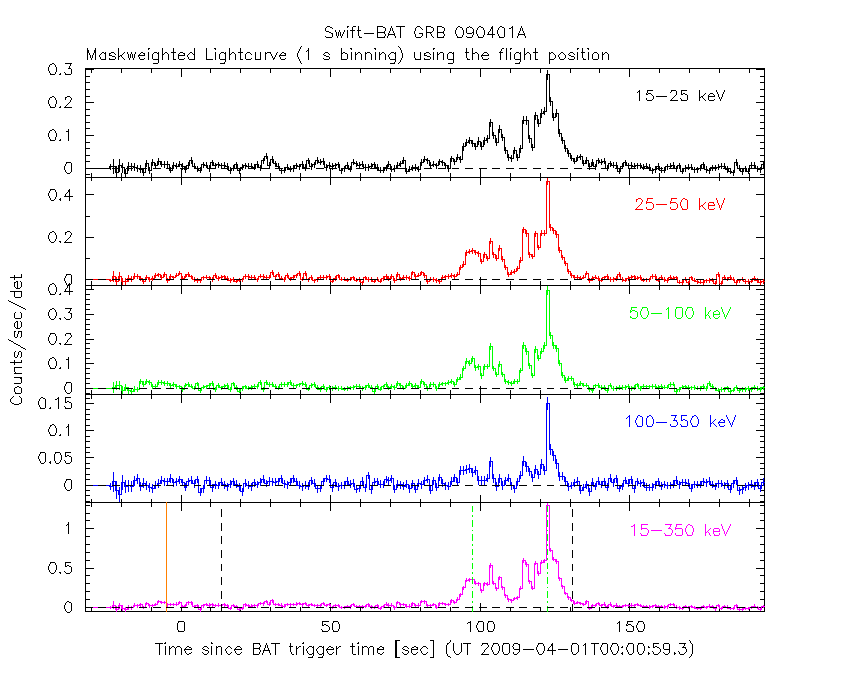 - 4) The verticle lines correspond to following: green dotted lines are T50 interval, black dotted lines are T90 interval, blue solid line(s) is a spacecraft slew start time, and orange solid line(s) is a spacecraft slew end time.