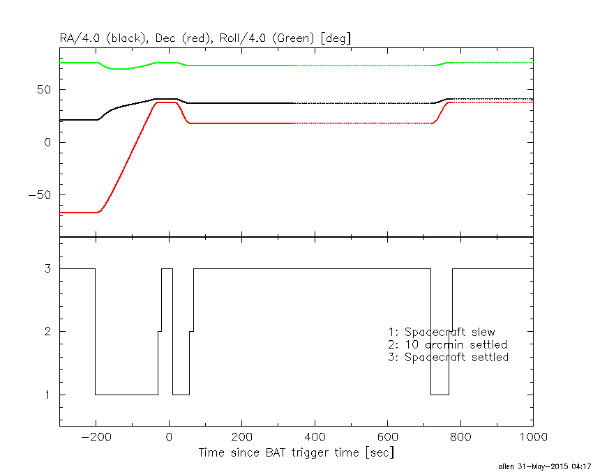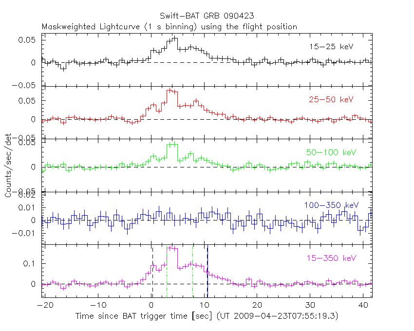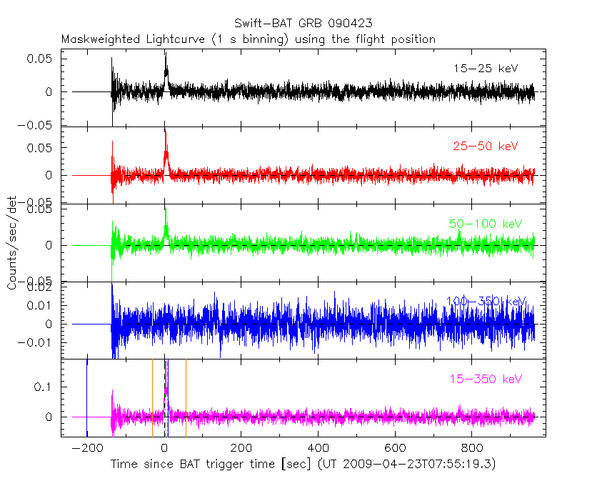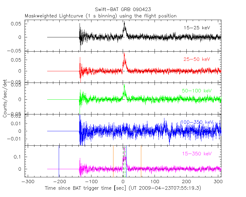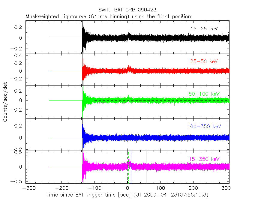 - 4) The verticle lines correspond to following: green dotted lines are T50 interval, black dotted lines are T90 interval, blue solid line(s) is a spacecraft slew start time, and orange solid line(s) is a spacecraft slew end time.