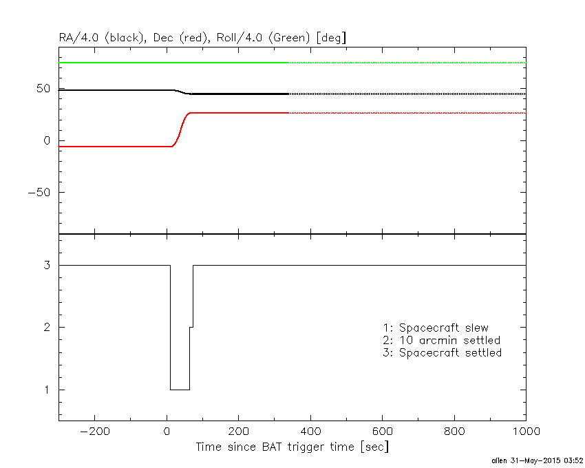 - 4) The verticle lines correspond to following: green dotted lines are T50 interval, black dotted lines are T90 interval, blue solid line(s) is a spacecraft slew start time, and orange solid line(s) is a spacecraft slew end time.