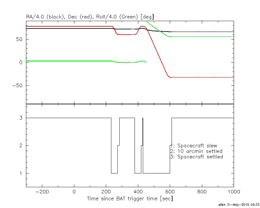 - 4) The verticle lines correspond to following: green dotted lines are T50 interval, black dotted lines are T90 interval, blue solid line(s) is a spacecraft slew start time, and orange solid line(s) is a spacecraft slew end time.