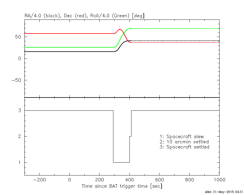 - 4) The verticle lines correspond to following: green dotted lines are T50 interval, black dotted lines are T90 interval, blue solid line(s) is a spacecraft slew start time, and orange solid line(s) is a spacecraft slew end time.