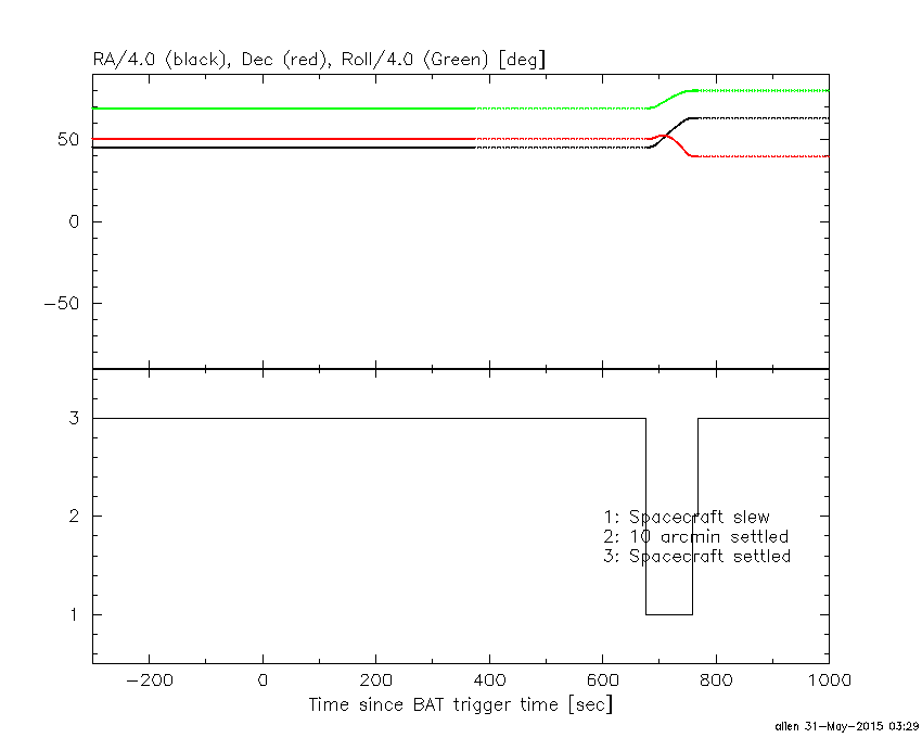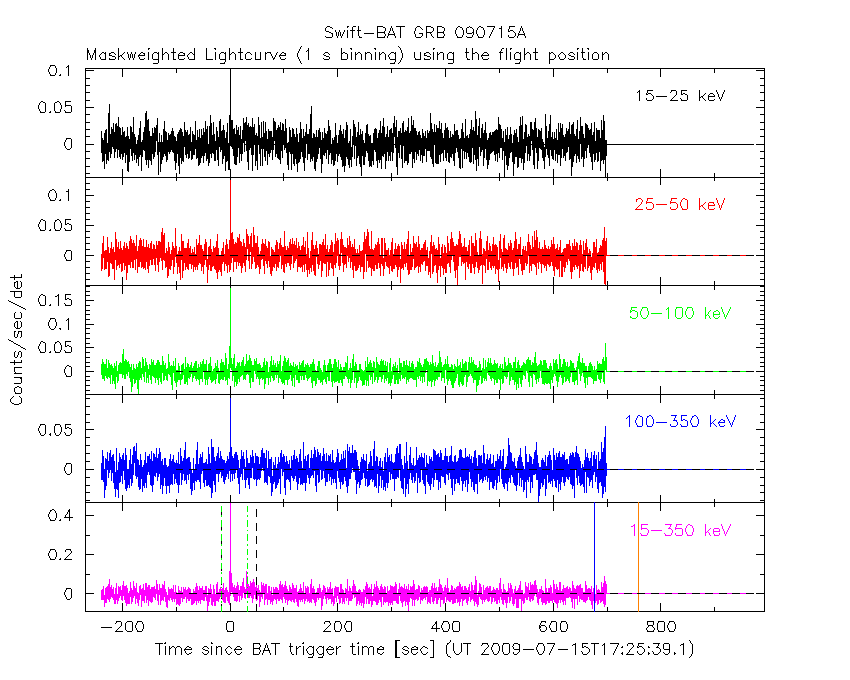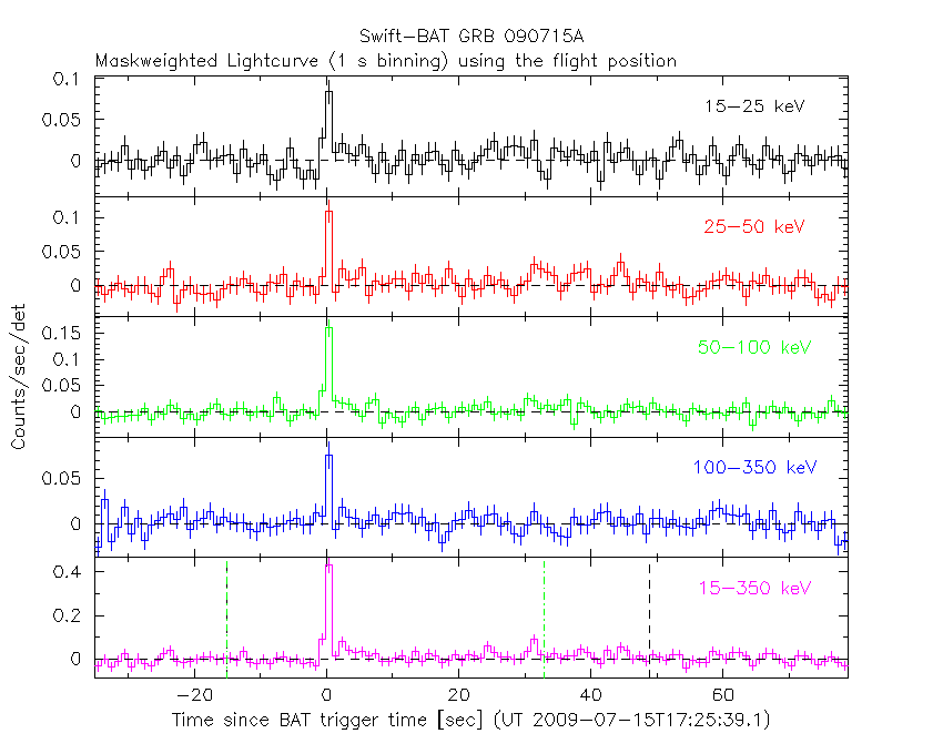 - 4) The verticle lines correspond to following: green dotted lines are T50 interval, black dotted lines are T90 interval, blue solid line(s) is a spacecraft slew start time, and orange solid line(s) is a spacecraft slew end time.