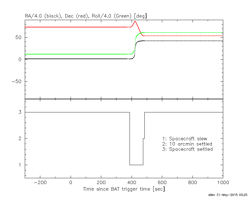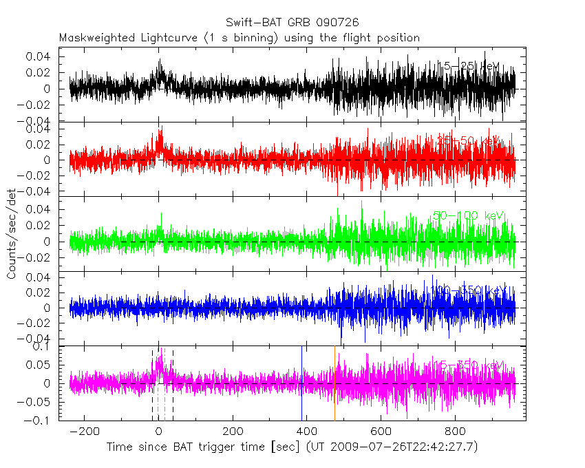 - 4) The verticle lines correspond to following: green dotted lines are T50 interval, black dotted lines are T90 interval, blue solid line(s) is a spacecraft slew start time, and orange solid line(s) is a spacecraft slew end time.